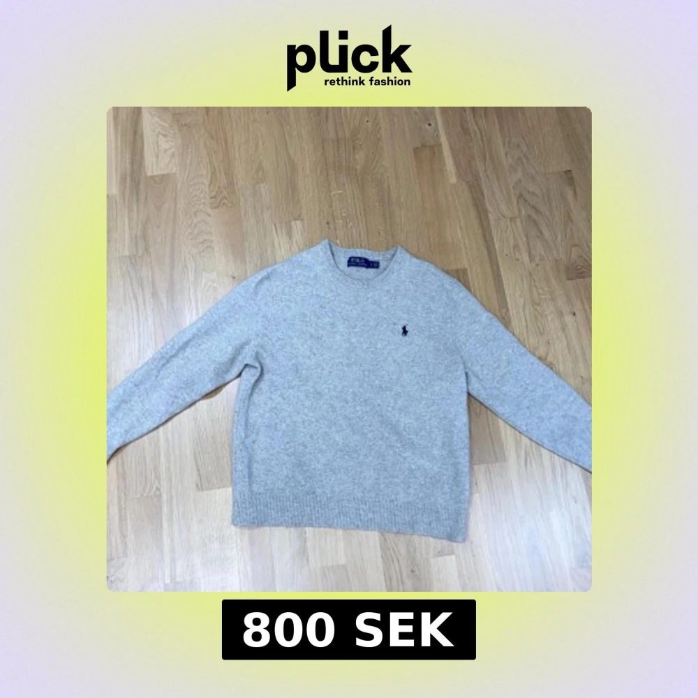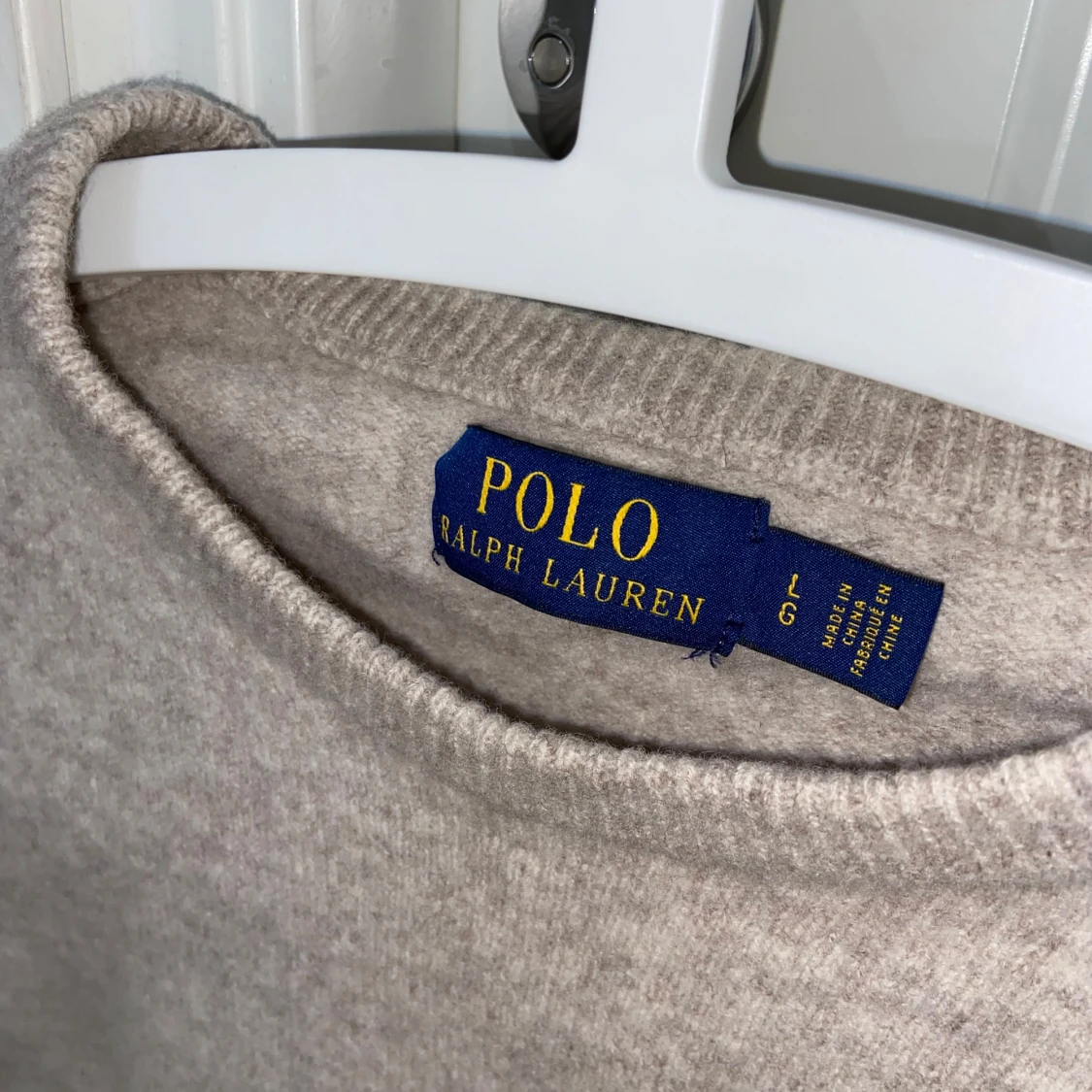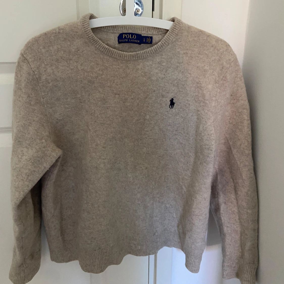 Säljer en klassisk beige stickad tröja från Polo Ralph Lauren med rund halsringning och diskret broderad logga på bröstet. Perfekt för en stilren och enkel look.