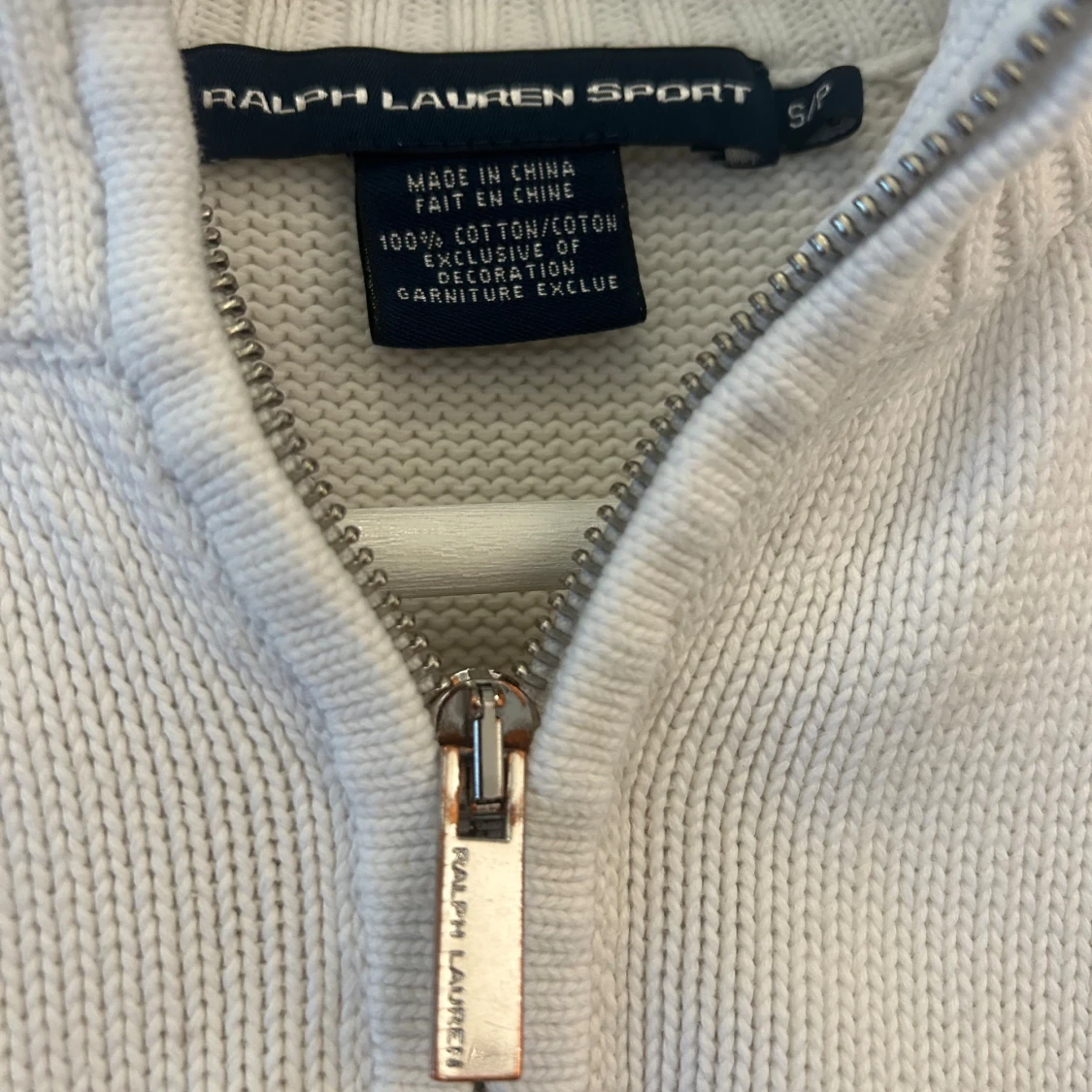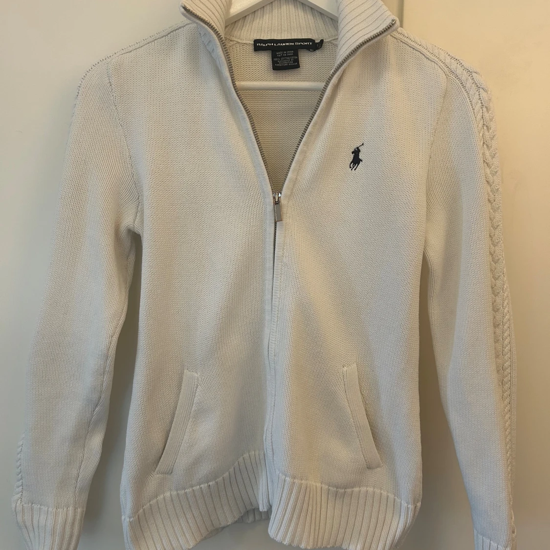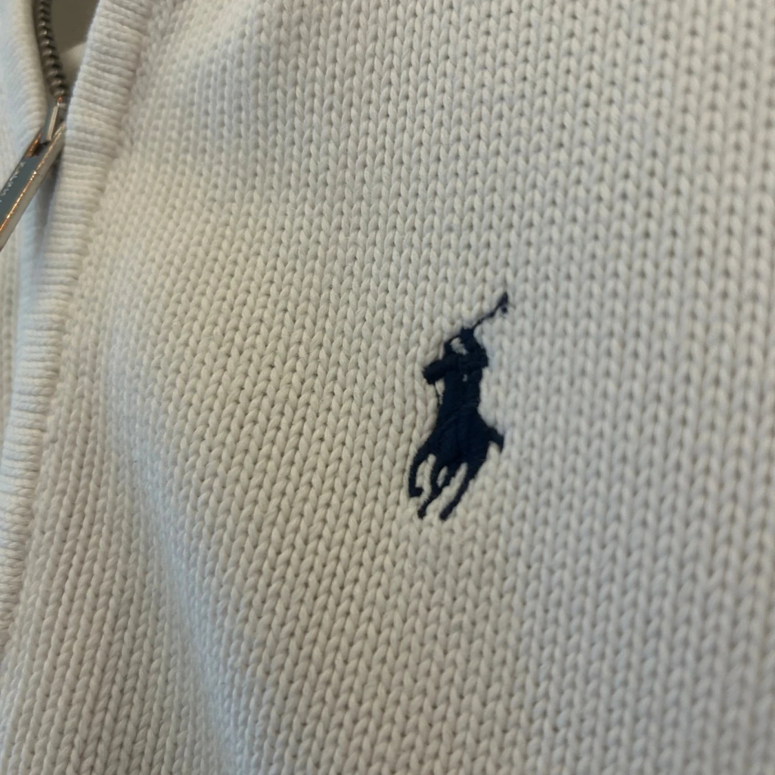 Snygg vit stickad kofta från Ralph Lauren Sport med dragkedja och ribbade muddar. Tröjan har långärmade ärmar, två fickor fram och ett mörkblått broderat Polo-logo på bröstet. Flätad detalj längs axlarna och tillverkad i 100% bomull. Köpt på plick för 1099kr, säljer då tröjan är för liten på mig. Storlek S men sitter som XS.