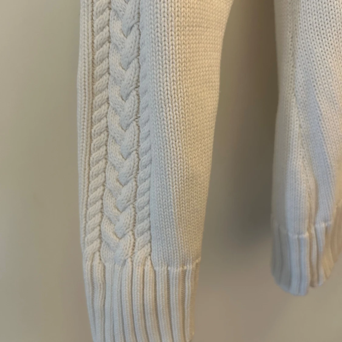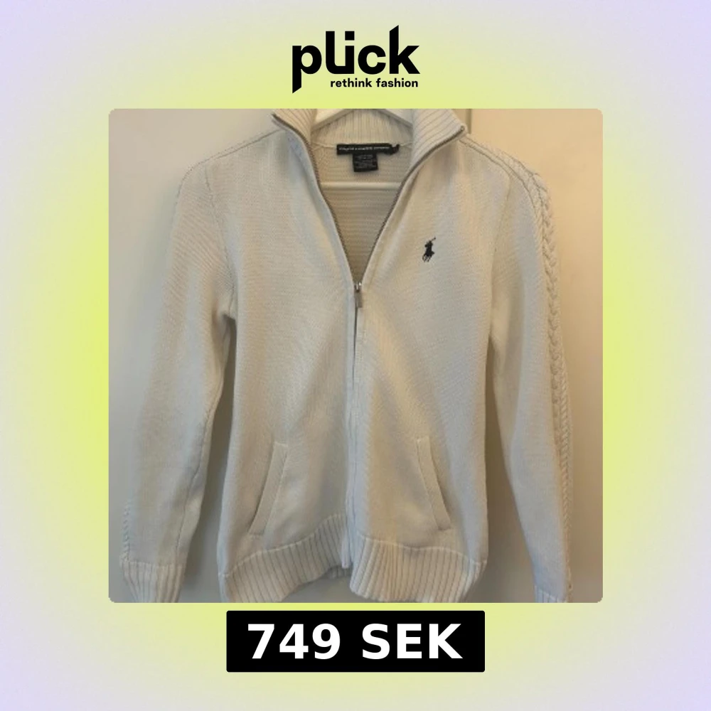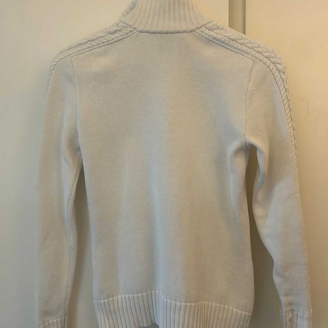 Snygg vit stickad kofta från Ralph Lauren Sport med dragkedja och ribbade muddar. Tröjan har långärmade ärmar, två fickor fram och ett mörkblått broderat Polo-logo på bröstet. Flätad detalj längs axlarna och tillverkad i 100% bomull. Köpt på plick för 1099kr, säljer då tröjan är för liten på mig. Storlek S men sitter som XS.
