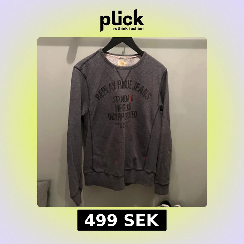 Säljer en grå sweatshirt från Replay med tryck på framsidan. Tröjan har långa ärmar och rund halsringning. Perfekt för en avslappnad stil.