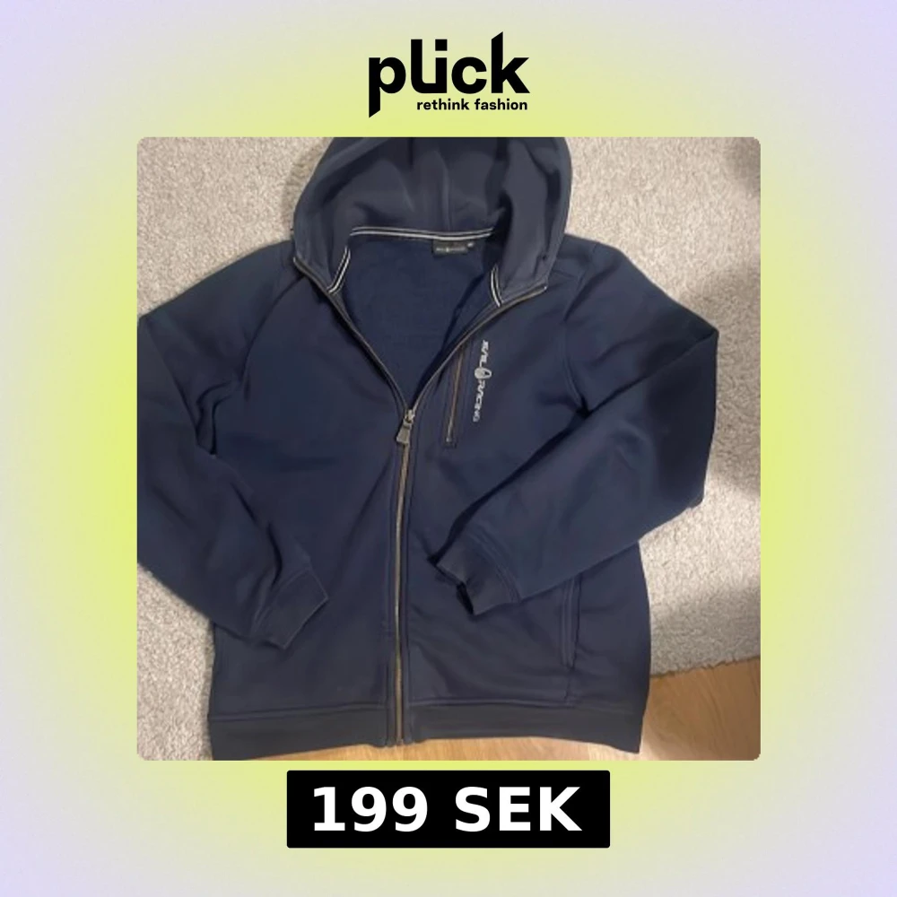 Säljer en snygg mörkblå hoodie från Sail Racing med dragkedja och huva. Perfekt för kyliga dagar. Den har långa ärmar och en stilren design med logotyp på bröstet. Passar både till vardags och mer avslappnade tillfällen. Tyvärr finns det ett litet hål vid luvan som man inte tänker på. Pris går att diskuteras.