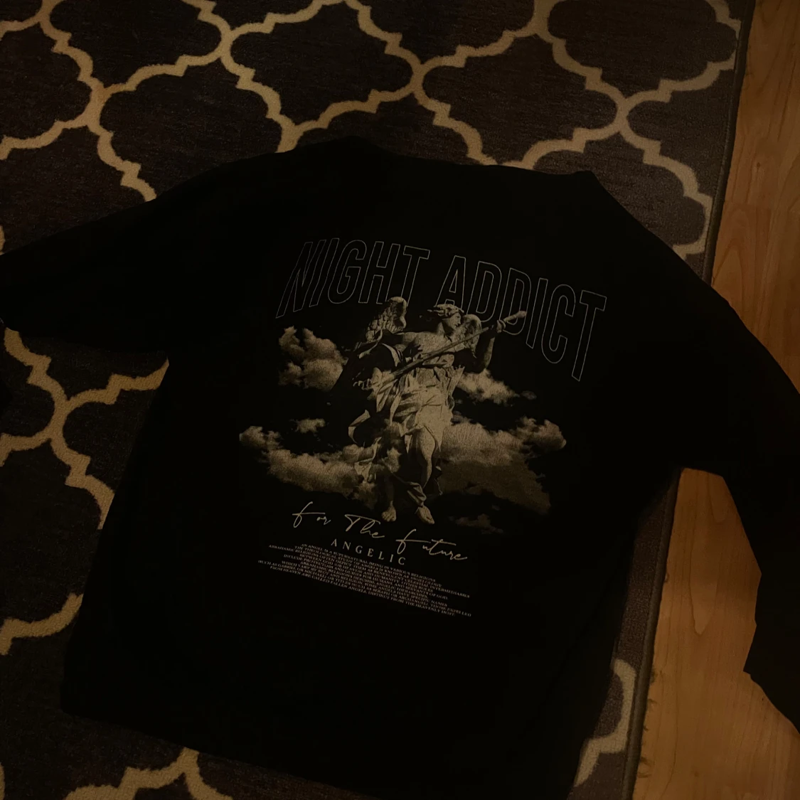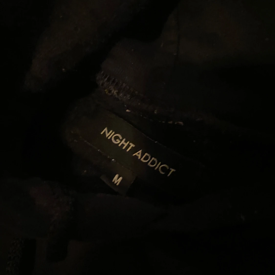 Säljer en svart hoodie från Night Addict med tryck på baksidan. Tröjan har en klassisk design med huva och långa ärmar. Perfekt för en avslappnad stil. Köpt på zalando för ungefär ett halvår sedan!