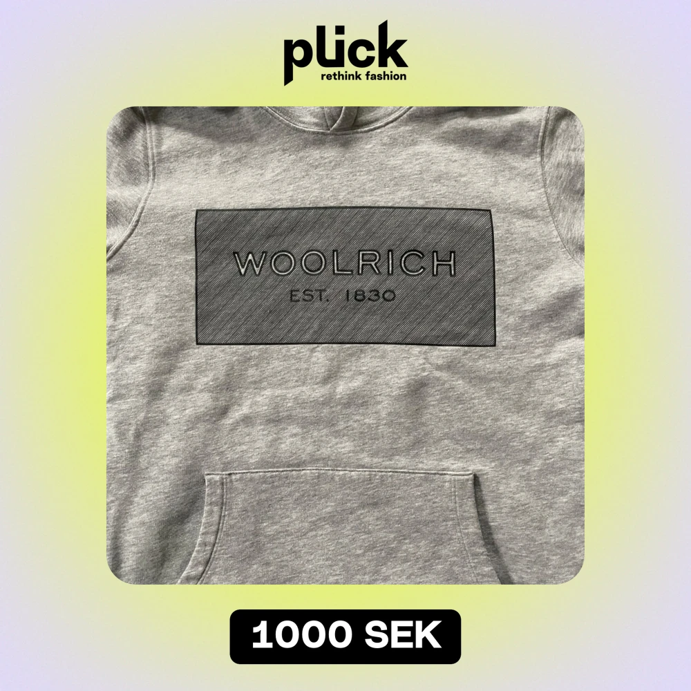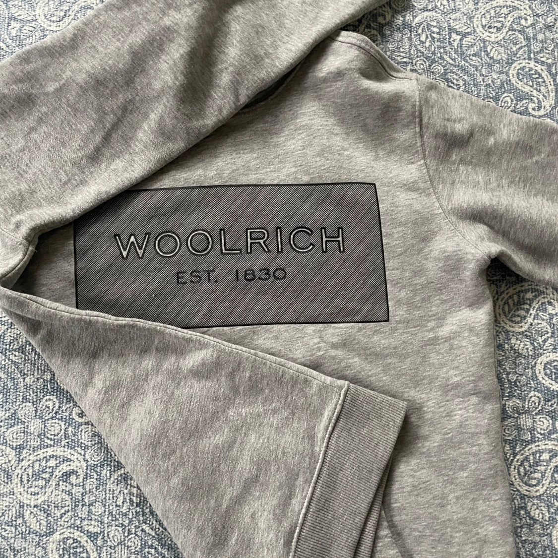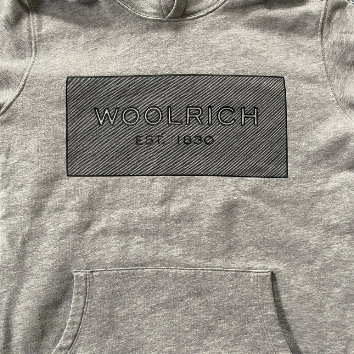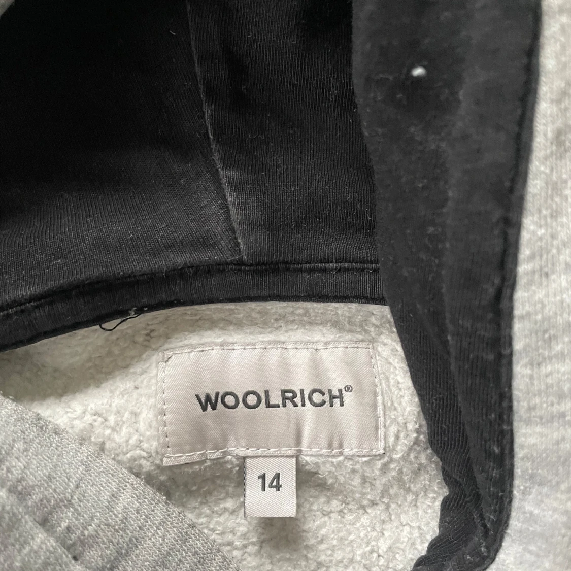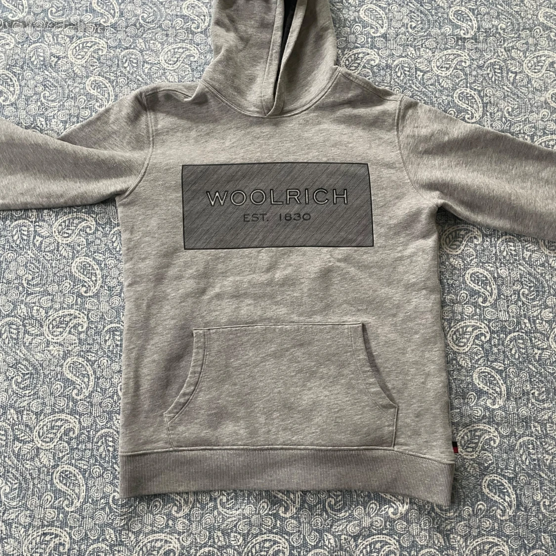 Säljer en snygg grå hoodie från Woolrich i storlek 14. Den har en stor ficka fram och ett stilrent tryck med 'Woolrich Est. 1830' på bröstet. Perfekt för kyliga dagar och ger en avslappnad look. 🩶För dig med stil woolrich,