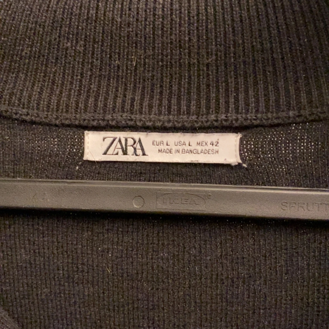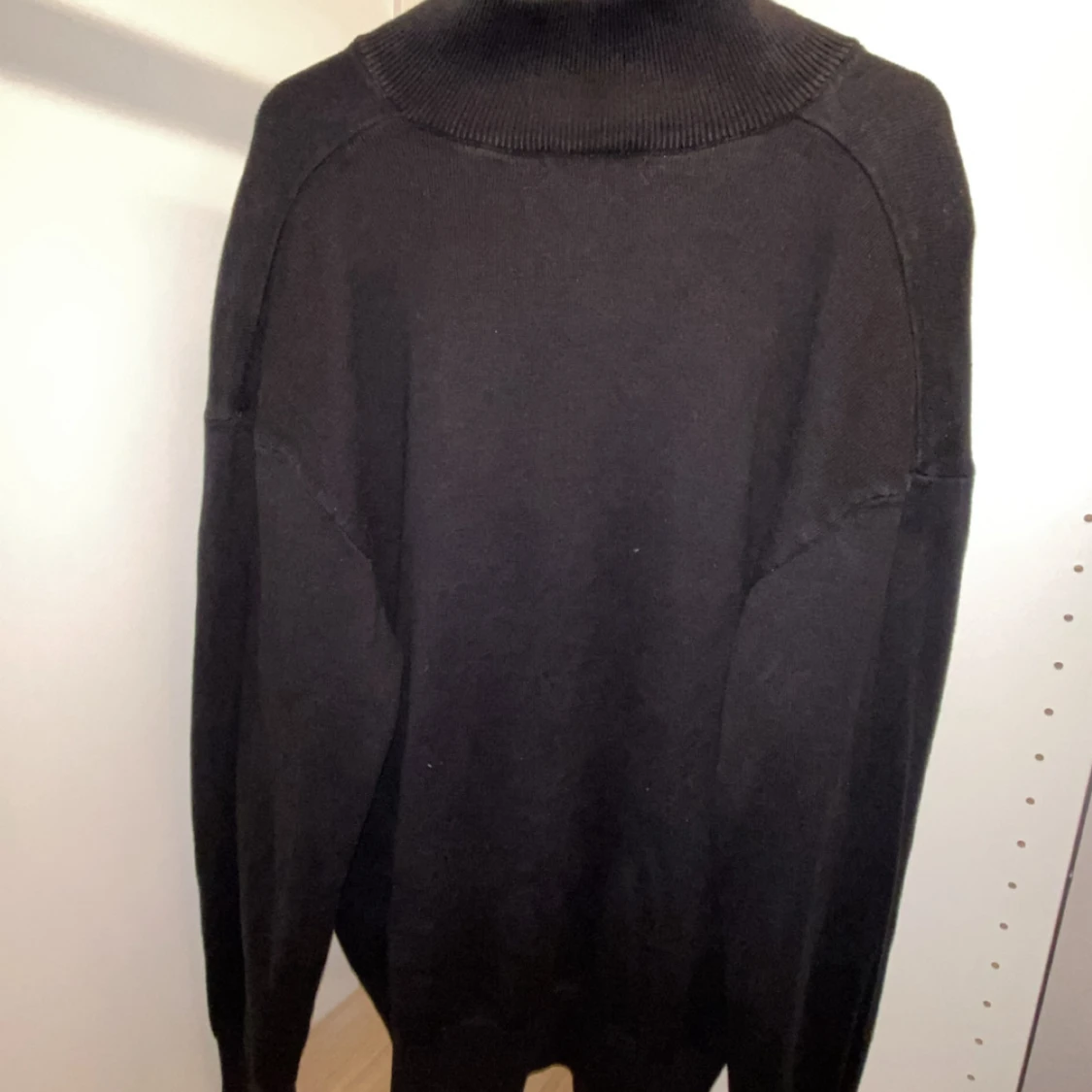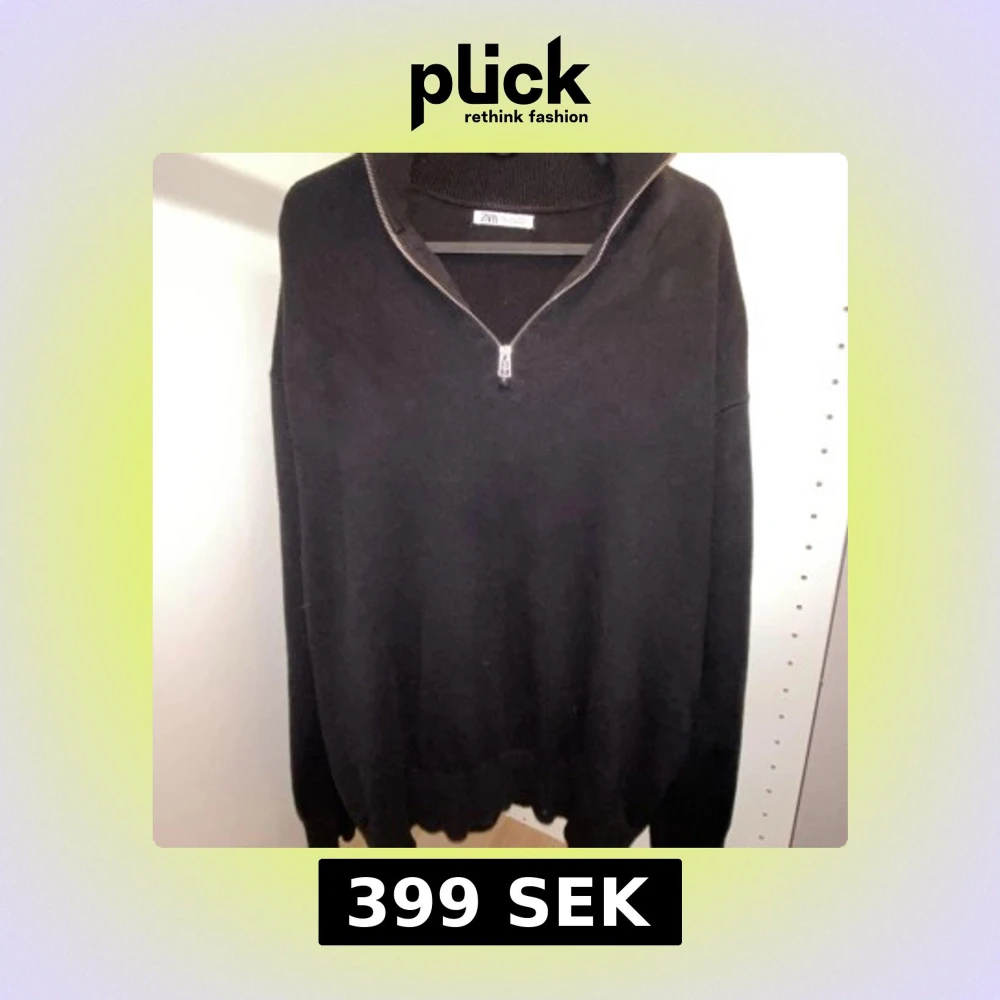 Svart stickad tröja från Zara i storlek L med hög krage och half zip-dragkedja. Oversized passform och långa ärmar, perfekt för lager-på-lager. Ribbad krage och muddar ger en clean och stilren look. Den passar dig som är mellan M-L. Skriv till mig om du har några funderingar.