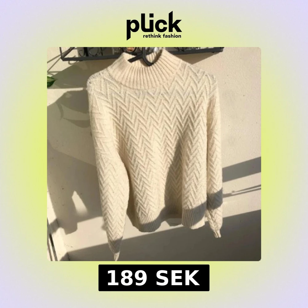 Supermysig vit stickad polotröja med snyggt mönster. Tröjan har hög krage och långa ärmar med ribbade muddar. Den är S men passar M oxå