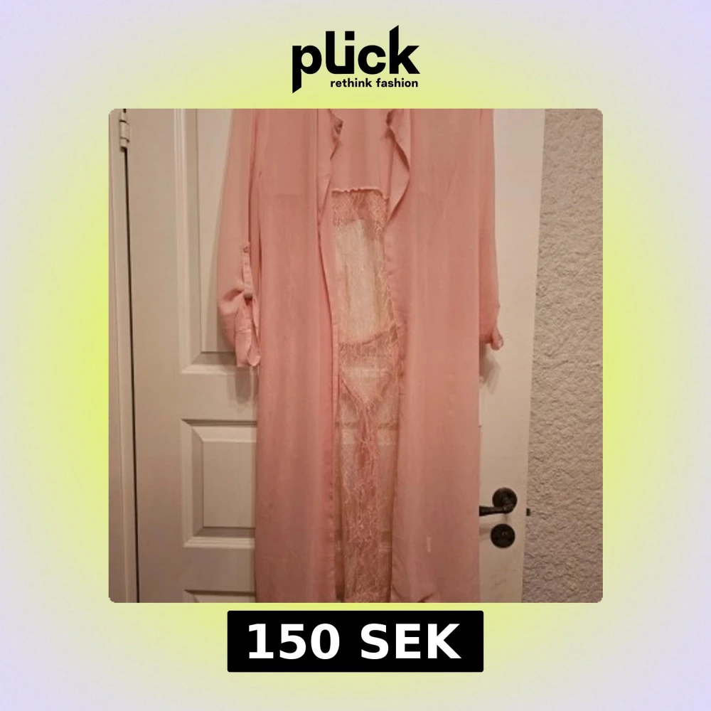 Lång, ljusrosa Cardian/kimono från Kacell i 100% polyester med transparent spetsdetaljer framtill och baktill. långa ärmar som kan vikas upp och knytband i midjan för en snygg siluett. Perfekt för dig som gillar romantisk och feminin stil. Är använd ca 2 gånger, men såg nu att där var en fläck på armen som jag inte har försökt ta bort.