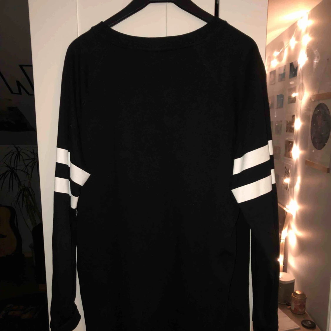 Lång, svart tjocktröja. Super skön och varm. Är storlek S men är ganska over sized så passar M/L