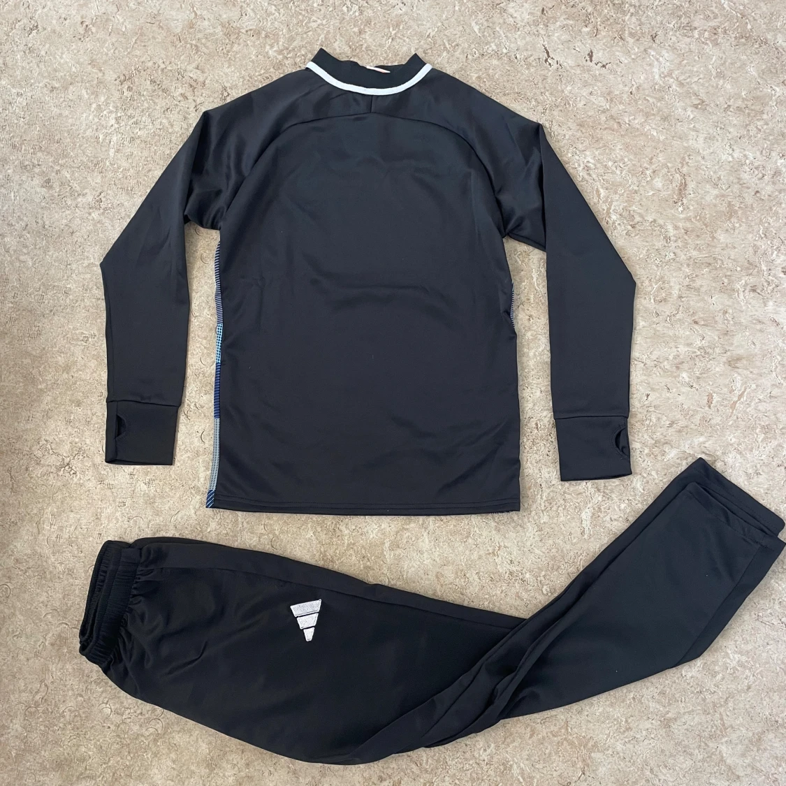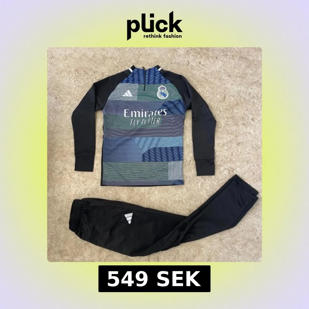 Säljer en långärmad Real Madrid träningströja från Adidas i svart och blått med grafiskt mönster framtill. Tröjan har half zip, klubbmärke och Adidas-logga på bröstet. Tillverkad i polyester, perfekt för fotbollsträning.
