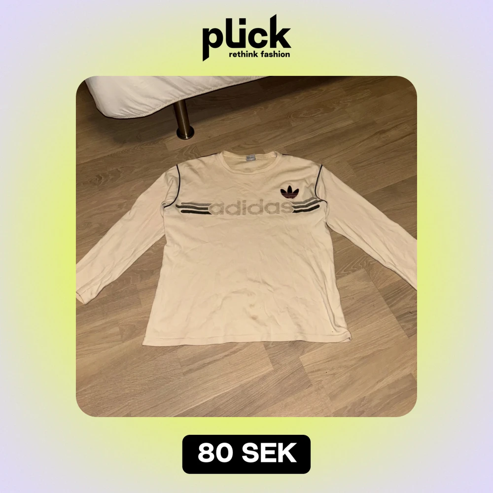 supersnygg beige adidaströja med coolt tryck🎀 storlek L men passar mindre storlekar (jag är S). tröjan har en fläck på armen som antagligen går bort i tvätten! hör av dig vid frågor/prisförslag❤️