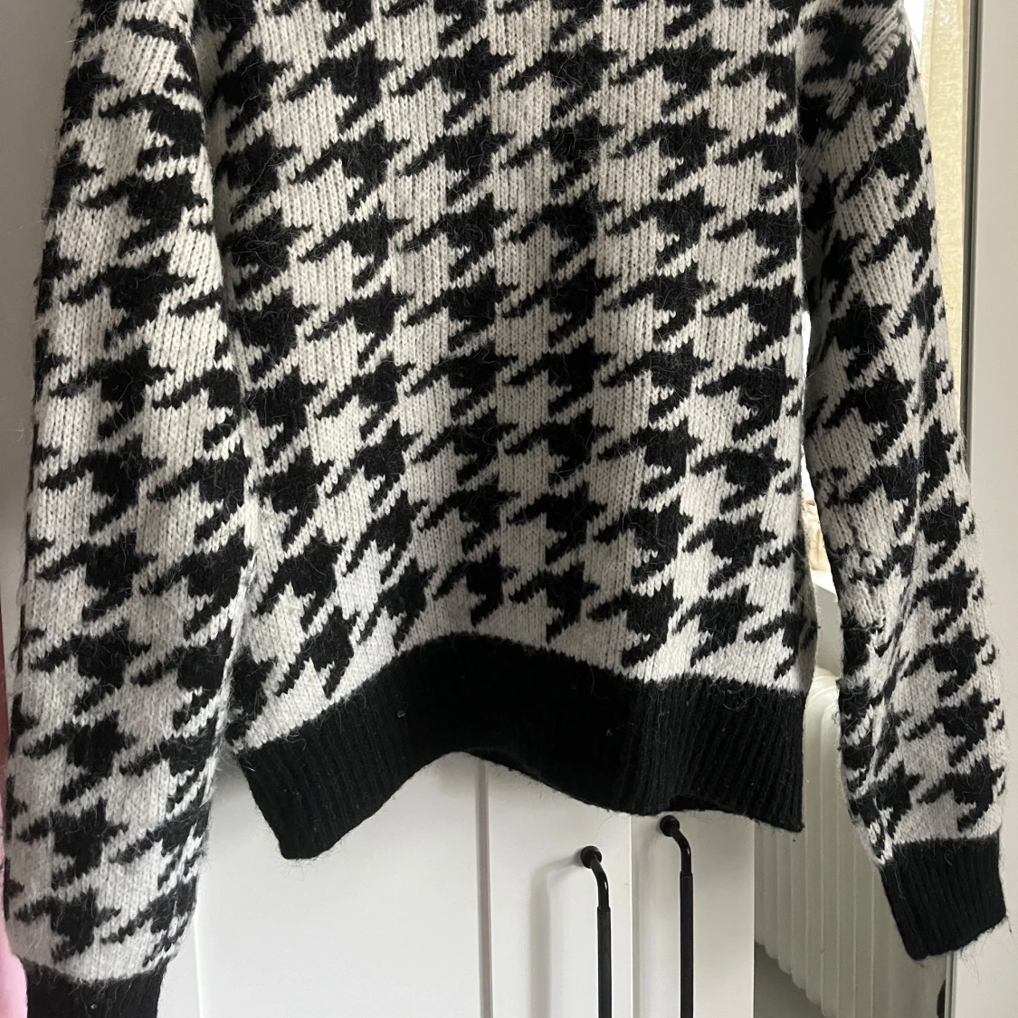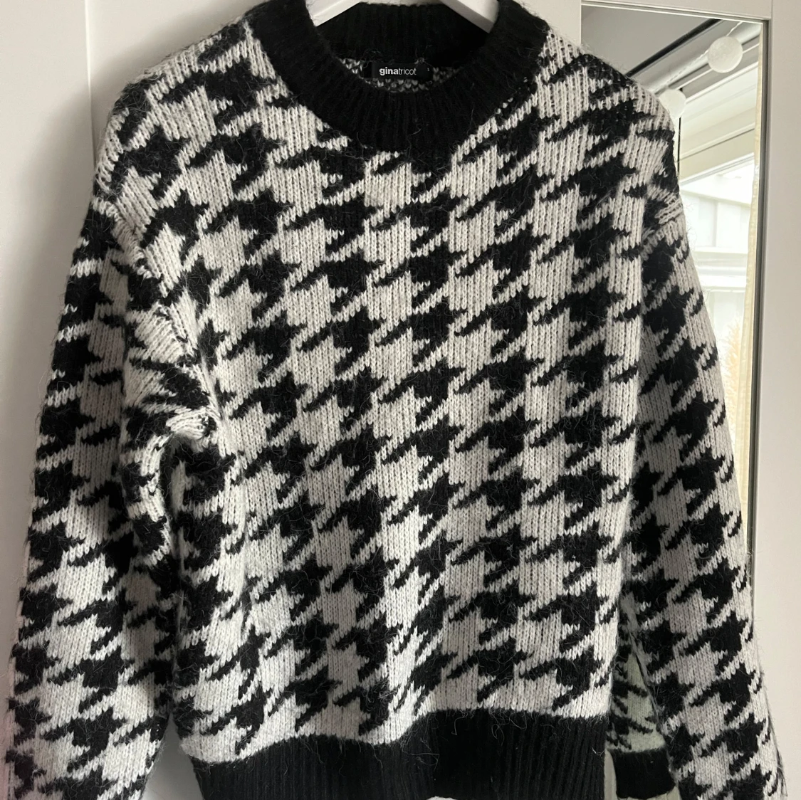 Säljer en stickad tröja från Gina Tricot i svart och vitt med klassiskt hundtandsmönster. Tröjan har rund halsringning, långa ärmar och ribbade muddar vid ärmslut och nederkant. Perfekt för kyligare dagar! Använd få gånger. Skriv för fler bilder💞
