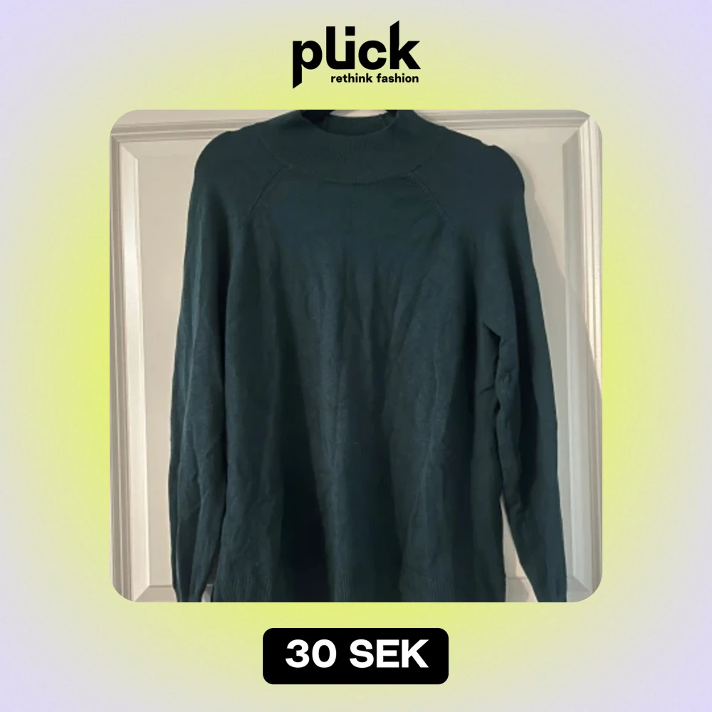En grön långärmad tröja med lite tyg upp vid nacken samt sitter åt vid slutet av armen. Använd fåtal gånger och säljer för att den är för liten.