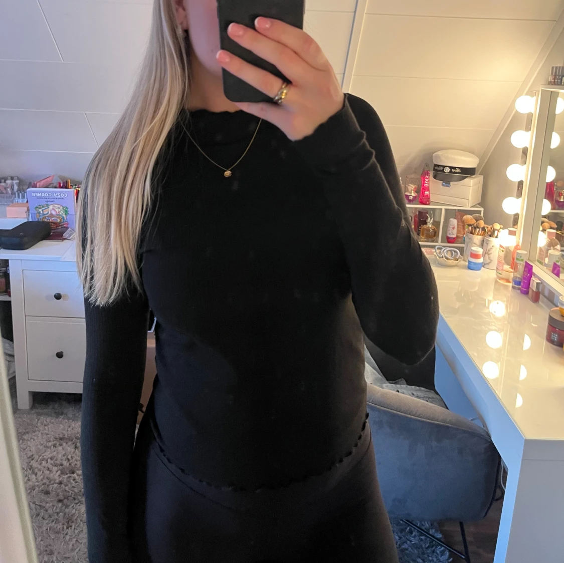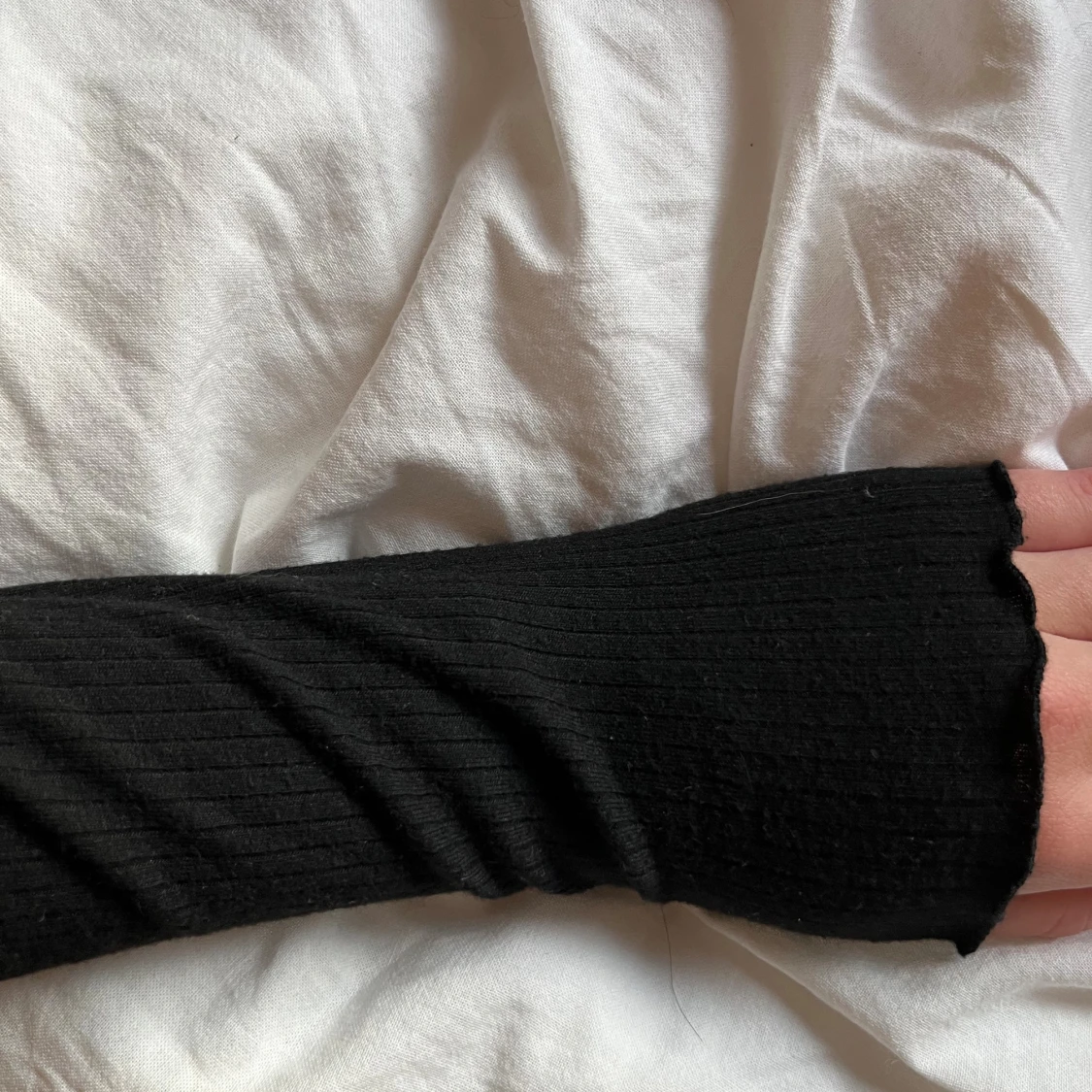 Svart långärmad tröja med ribbad struktur och vågiga kanter vid hals och ärmslut