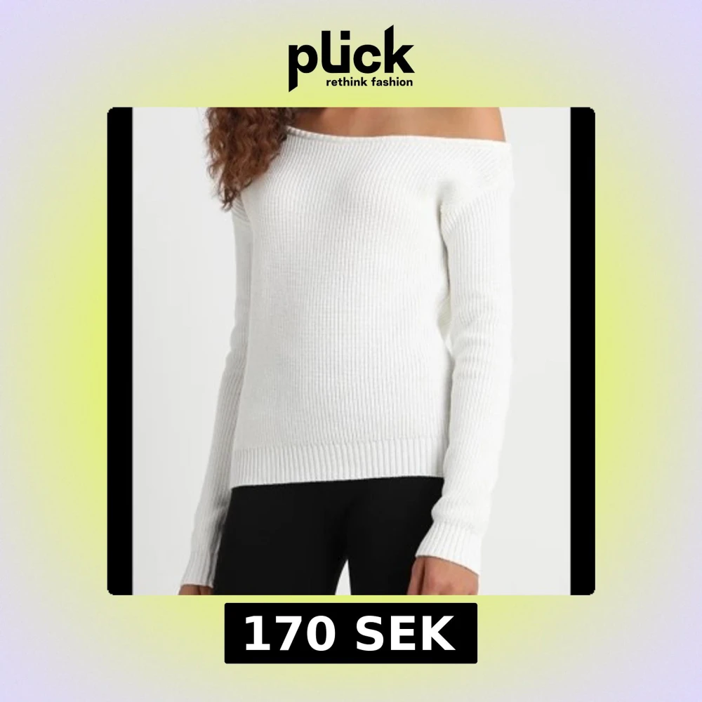 Säljer en stilren vit offshoulder stickad tröja. Den har en ribbad struktur och långa ärmar. Perfekt till våren och sommaren. Lånade bilder