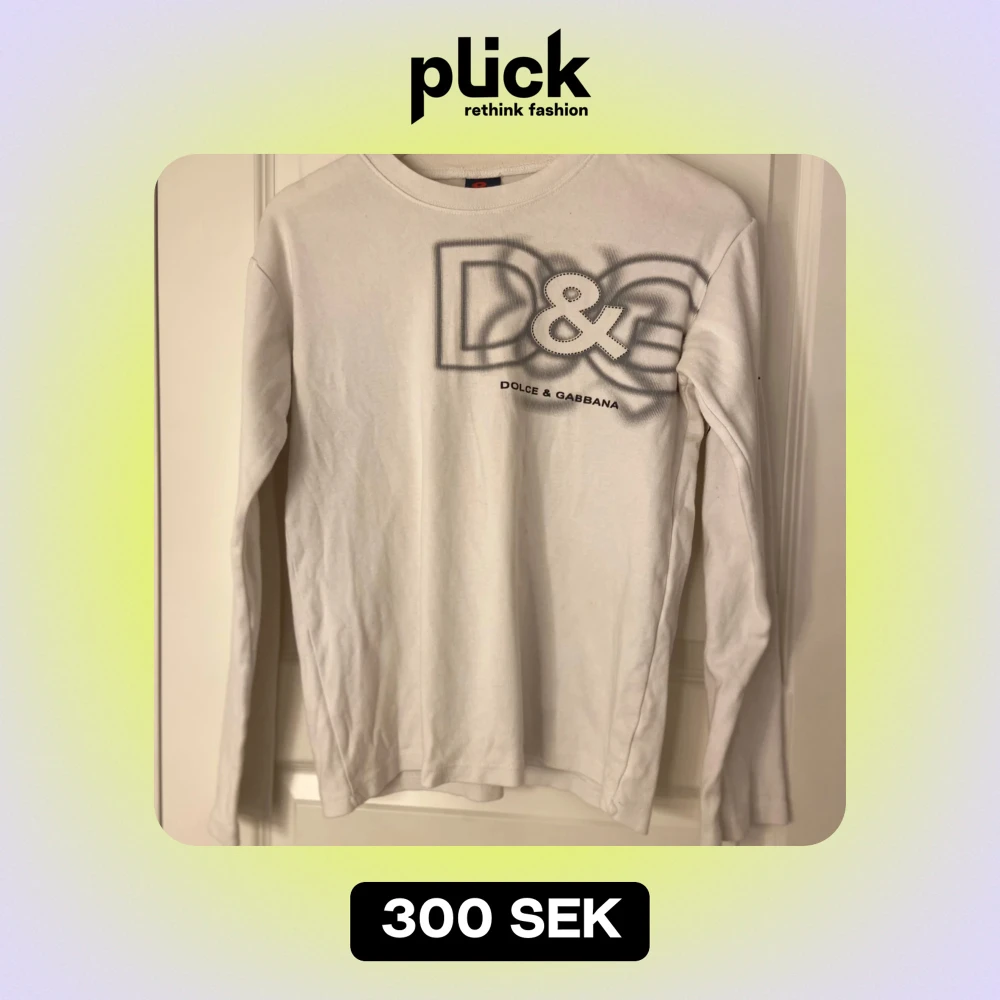 Säljer en stilren vit långärmad tröja från Dolce & Gabbana. Tröjan har ett stort D&G-tryck på framsidan och ett mindre tryck på baksidan. Ganska stor i storleken