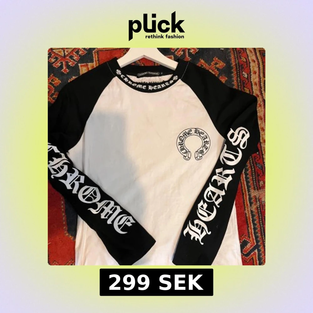 Säljer en svartvit långärmad tröja från Chrome Hearts. Tröjan har ett stort tryck på ärmarna och bröstet med märkets logotyp. Storlek M. Vet ej om den är äkta