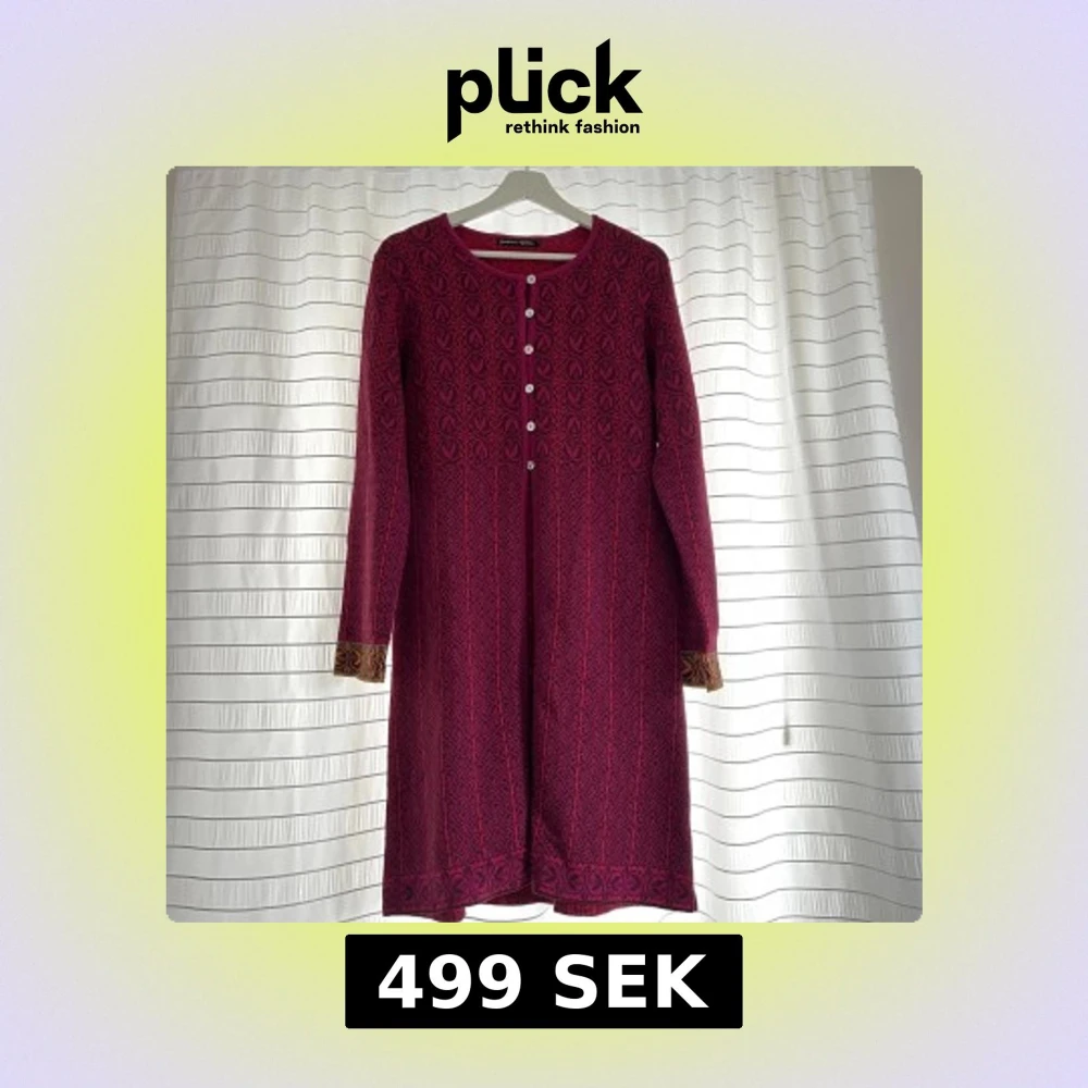 Röd/rosa kofta från Gudrun Sjödén med dekorativt mönster och långa ärmar. Koftan har rund halsringning, knappar framtill och kontrasterande detaljer vid ärmslut och nederkant. Nyskick, endast lappen inuti som är märkt med namn