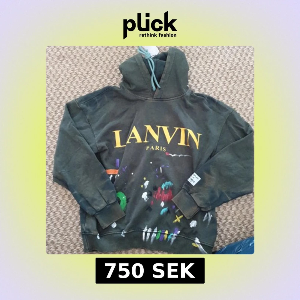 Cool mörkgrön hoodie från Lanvin Paris med stort gult tryck framtill och unika färgstänk i flera färger. Tröjan har huva med blå snörning och ribbade muddar. Perfekt för dig som vill sticka ut med en streetstyle-look.