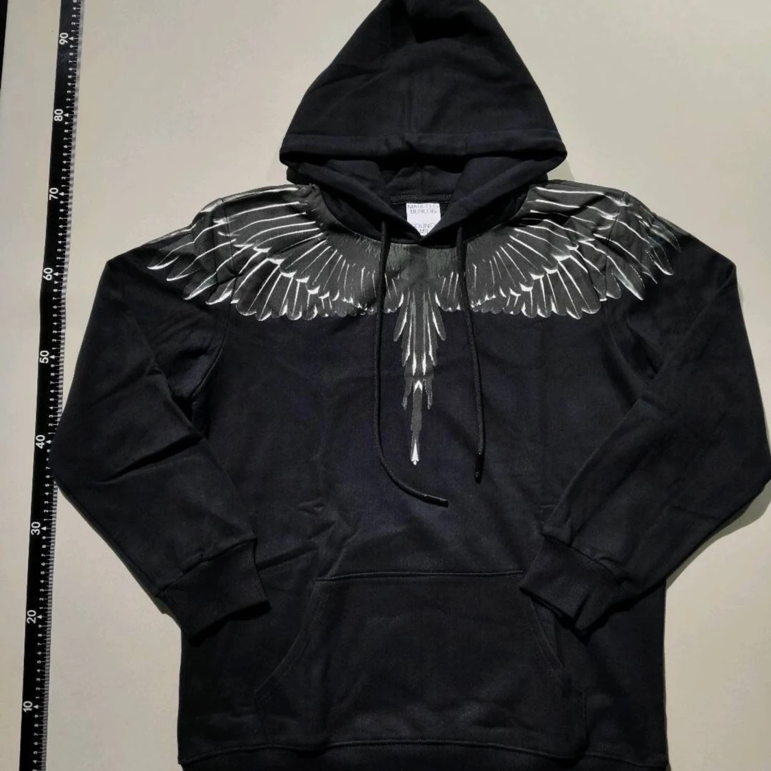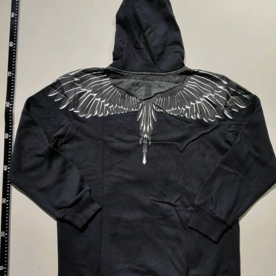 Svart hoodie från Marcelo Burlon med ikoniskt silverfärgat vingtryck över axlar och bröst. Tröjan har huva med snörning, känguruficka och ribbade muddar. Perfekt statement-plagg för dig som vill sticka ut.