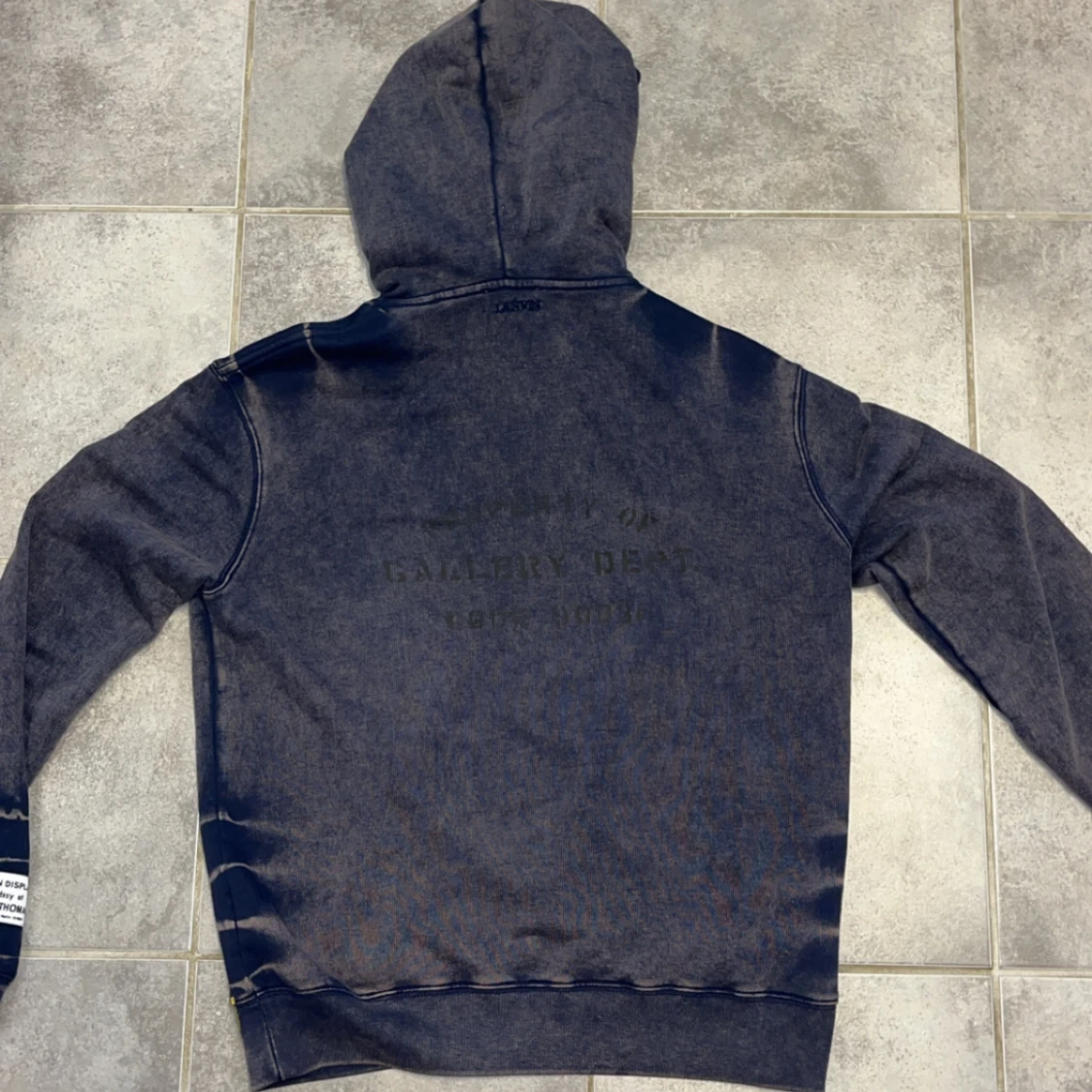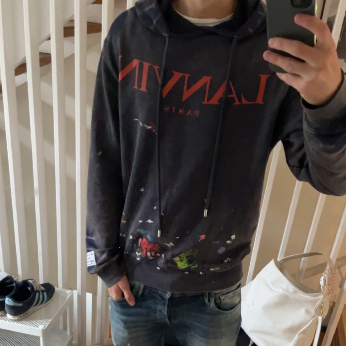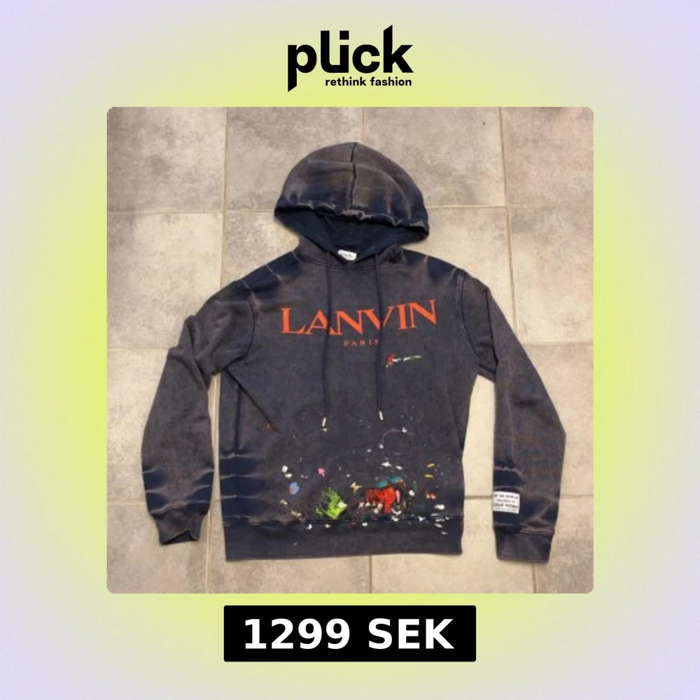 Säljer en mörkblå hoodie från Lanvin Paris med stor orange logga framtill och coolt färgstänksmönster nedtill. Tröjan har huva med snörning, lång ärm och en patch på vänster ärm. Perfekt för dig som gillar streetwear med konstnärlig vibe. Storlek M. Modellen på bilden är 185 cm och väger ca 70 kg