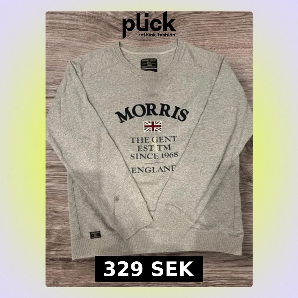 Snygg grå sweatshirt från Morris Gents i storlek Large. Tröjan har tryck med text och brittisk flagga på bröstet, rund hals och ribbade muddar vid ärmslut och nederkant. Perfekt för en chill och stilren look.