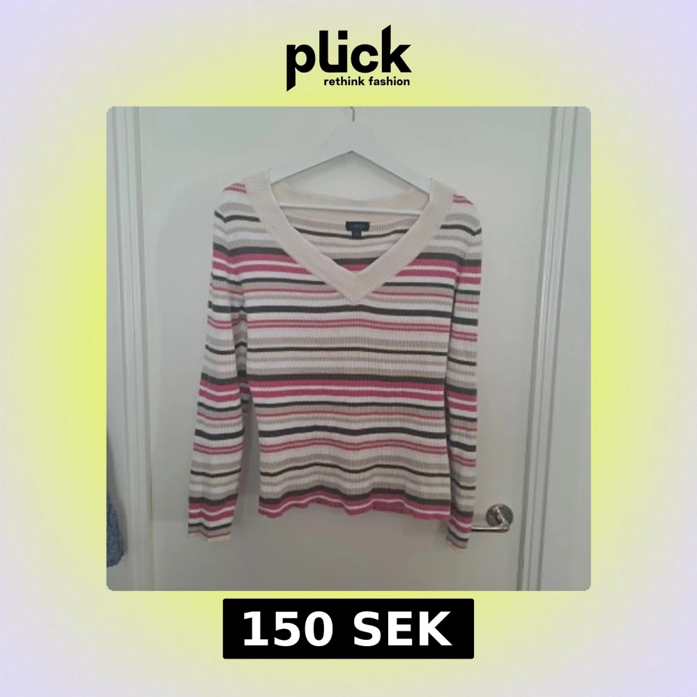 Randig långärmad tröja från äldre Lindex i ribbad bomull. Färgerna är beige, vit, rosa och khakigrön. Tröjan har v-ringad hals. 🩷