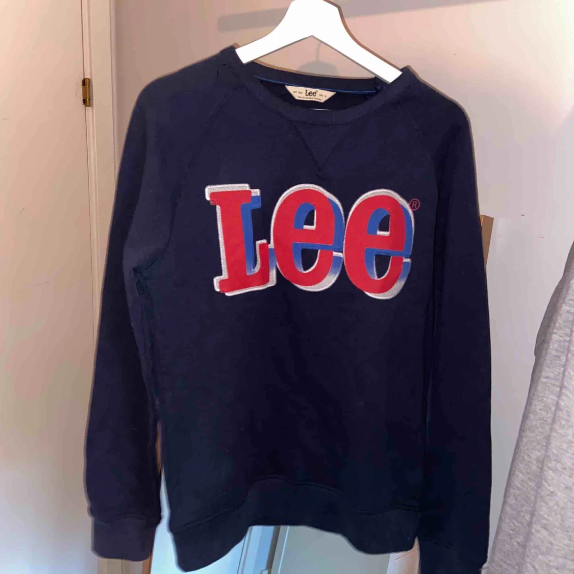 Blå Lee swetshirt med rött, vitt och blått tryck.🌸✨ Aldrig använd så är i väldigt bra skick! Frakt tillkommer!🌟