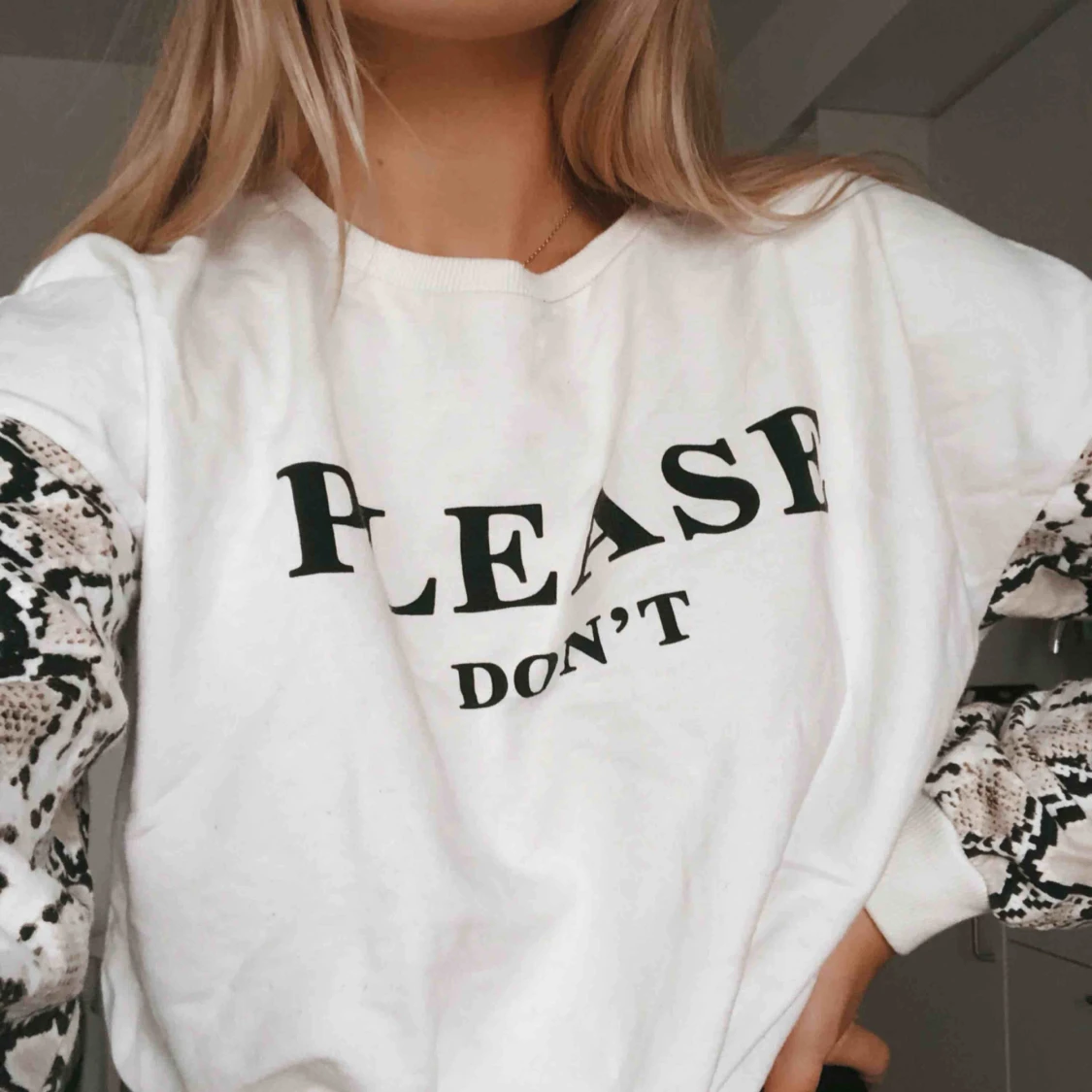 Tröja med texten ”please don’t” på framsidan och ärmar med ormskinnsmönster. Sparsamt använd. Dock med en liten fläck på framsidan som inte gått bort. Syns dock knappt.