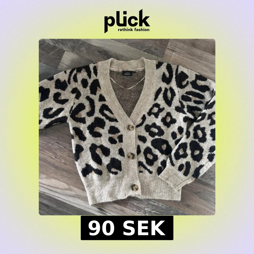 Säljer en beige kofta från KappAhl med svart leopardmönster. Koftan har v-ringning, knappar framtill och ribbade muddar vid ärmslut och nederkant. Aldrig använt