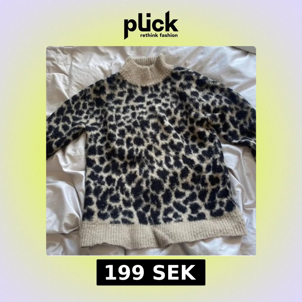 Säljer en stickad polotröja med leopardmönster i svart och beige. Tröjan har hög krage och långa ärmar samt ribbade muddar vid hals, ärmslut och nederkant. Perfekt för dig som vill sticka ut lite extra!