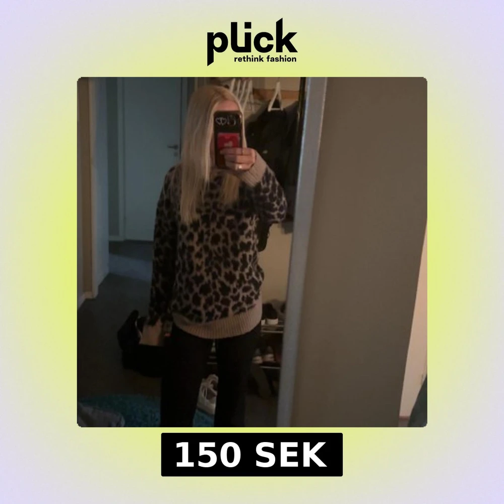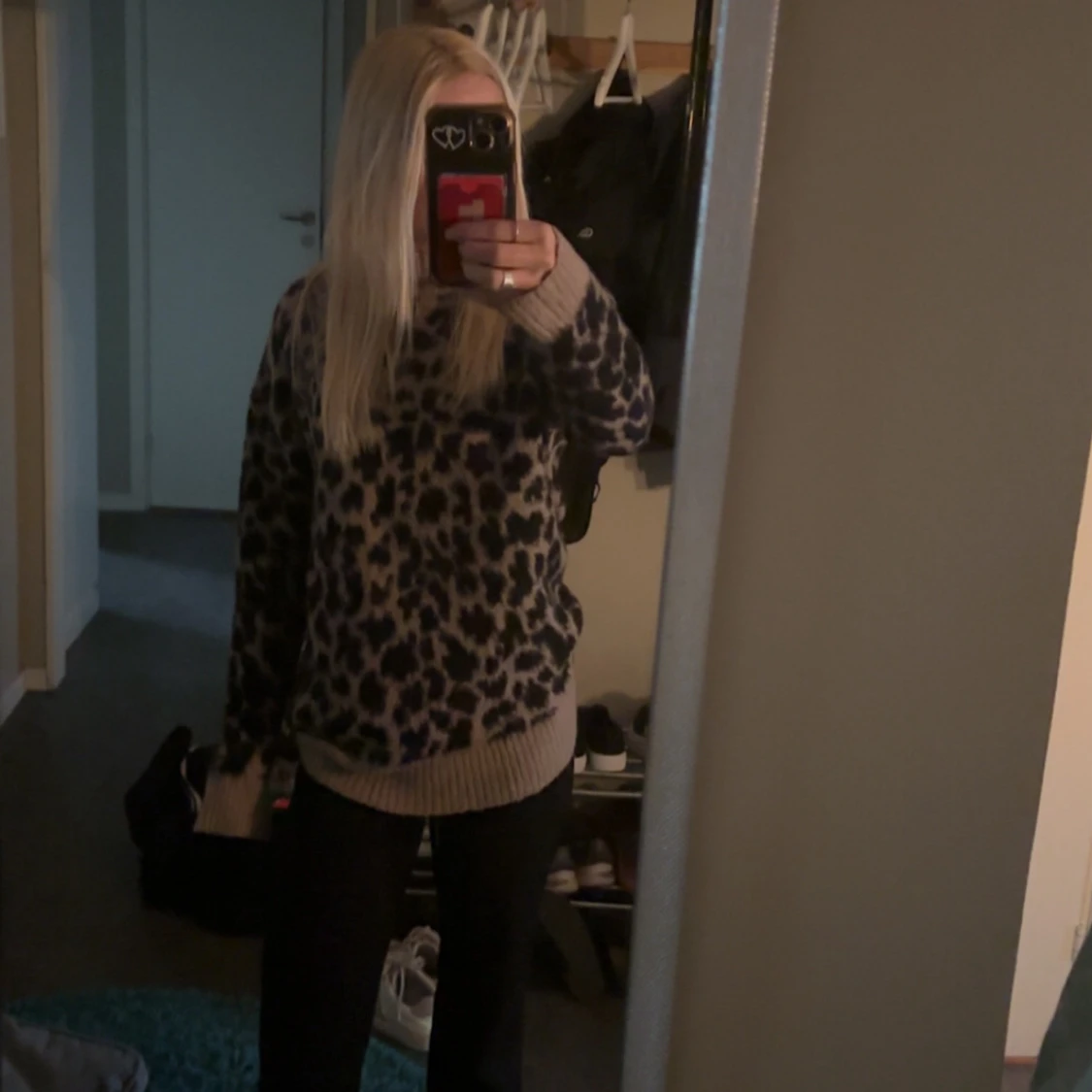 Säljer en oversized stickad tröja med leopardmönster i mörkblått och beige. Tröjan har breda ribbade muddar vid ärmslut och nederkant samt lång ärm. Perfekt för dig som vill sticka ut med en cool och trendig look.