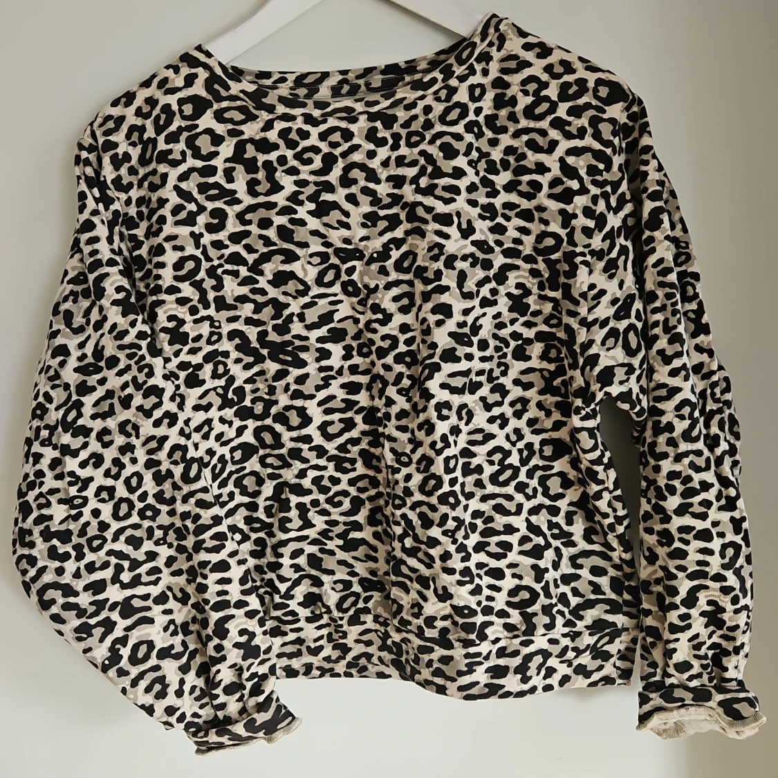 Säljer en leopardmönstrad tröja med långa ärmar och kortare modell. Tröjan har en lös passform och är perfekt för att ge en djärv touch till din outfit. Den är tillverkad i ett mjukt material som känns skönt mot huden.