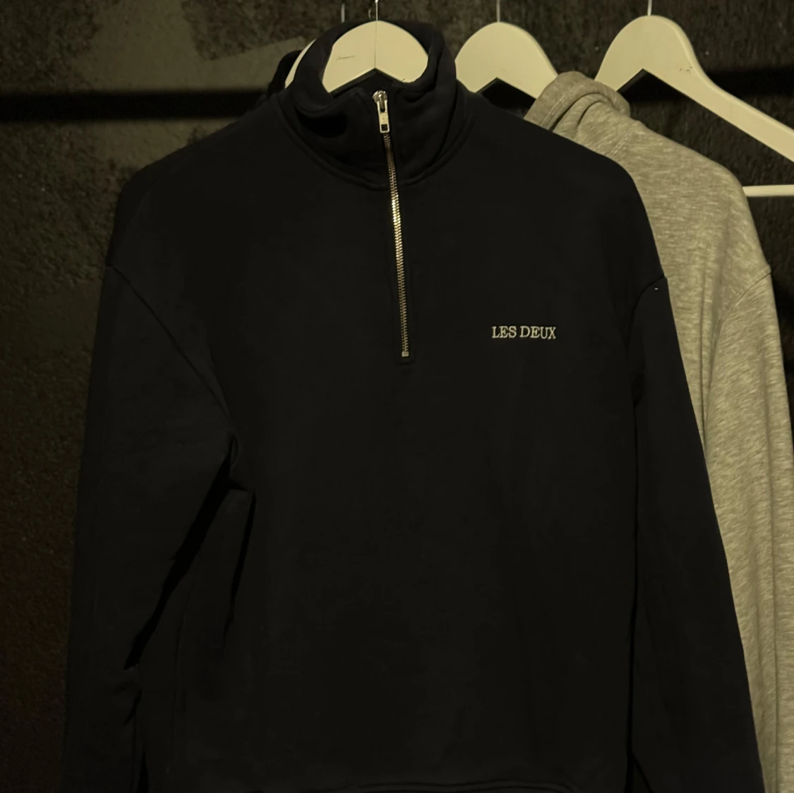 Säljer en tröja från Les Deux half zip mörkblå i fint skick endast använd få tal gånger, storlek S men passar m också. Inga skador eller liknande har du fler frågor tveka inte på att höra av dig//robin