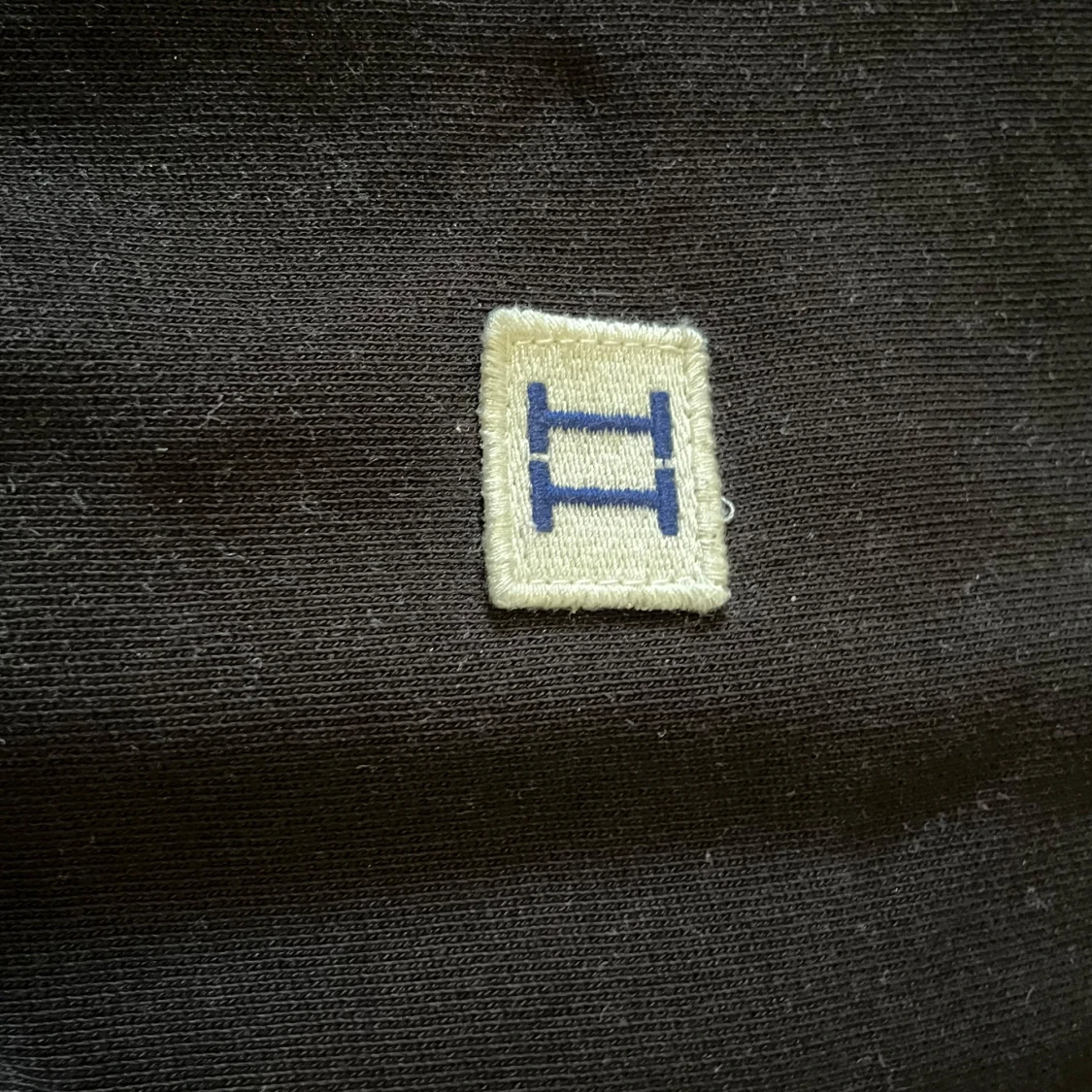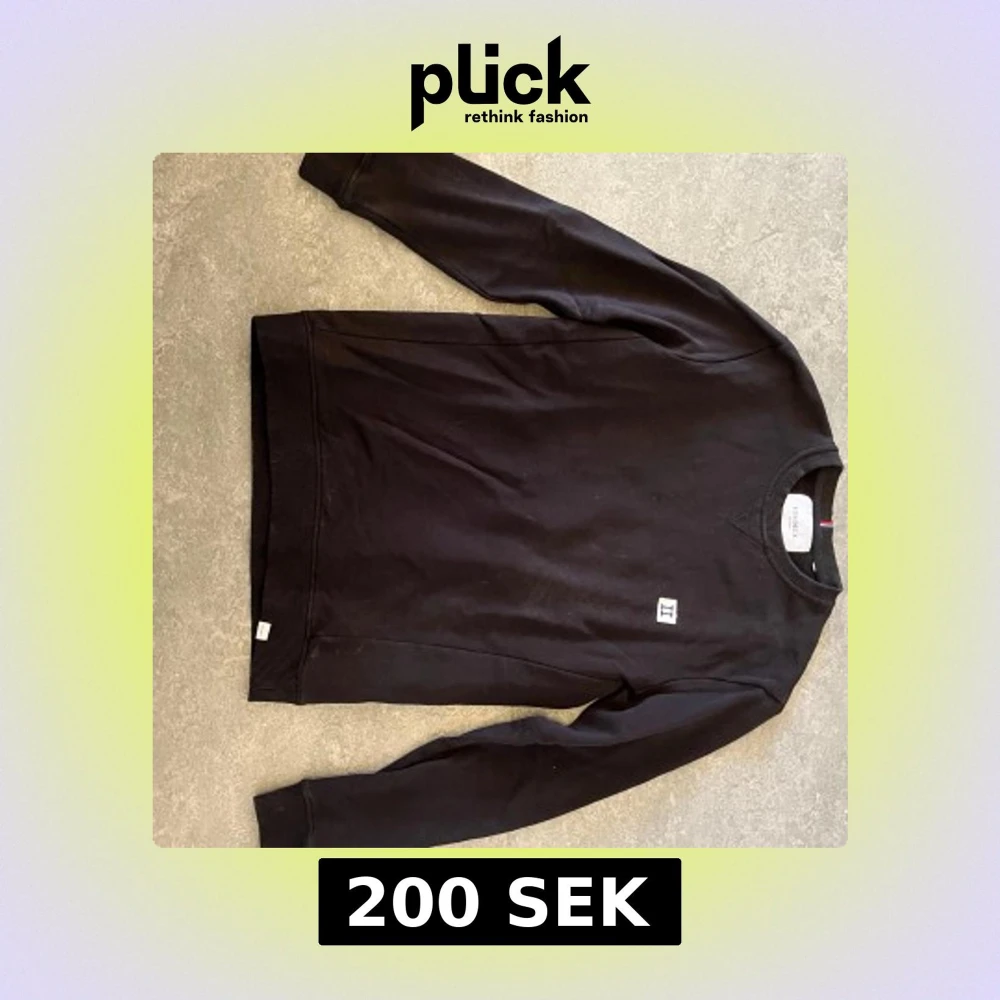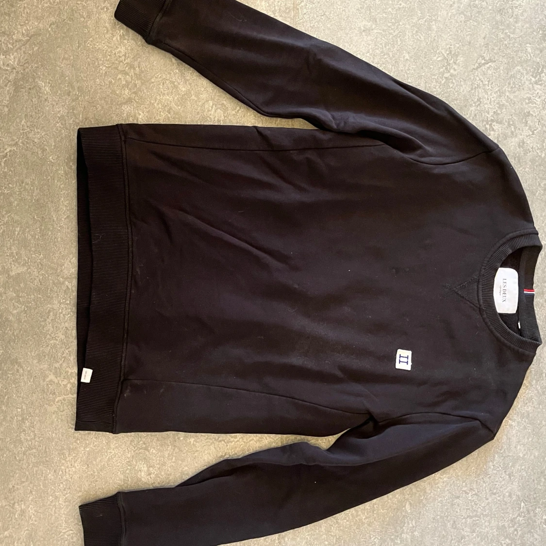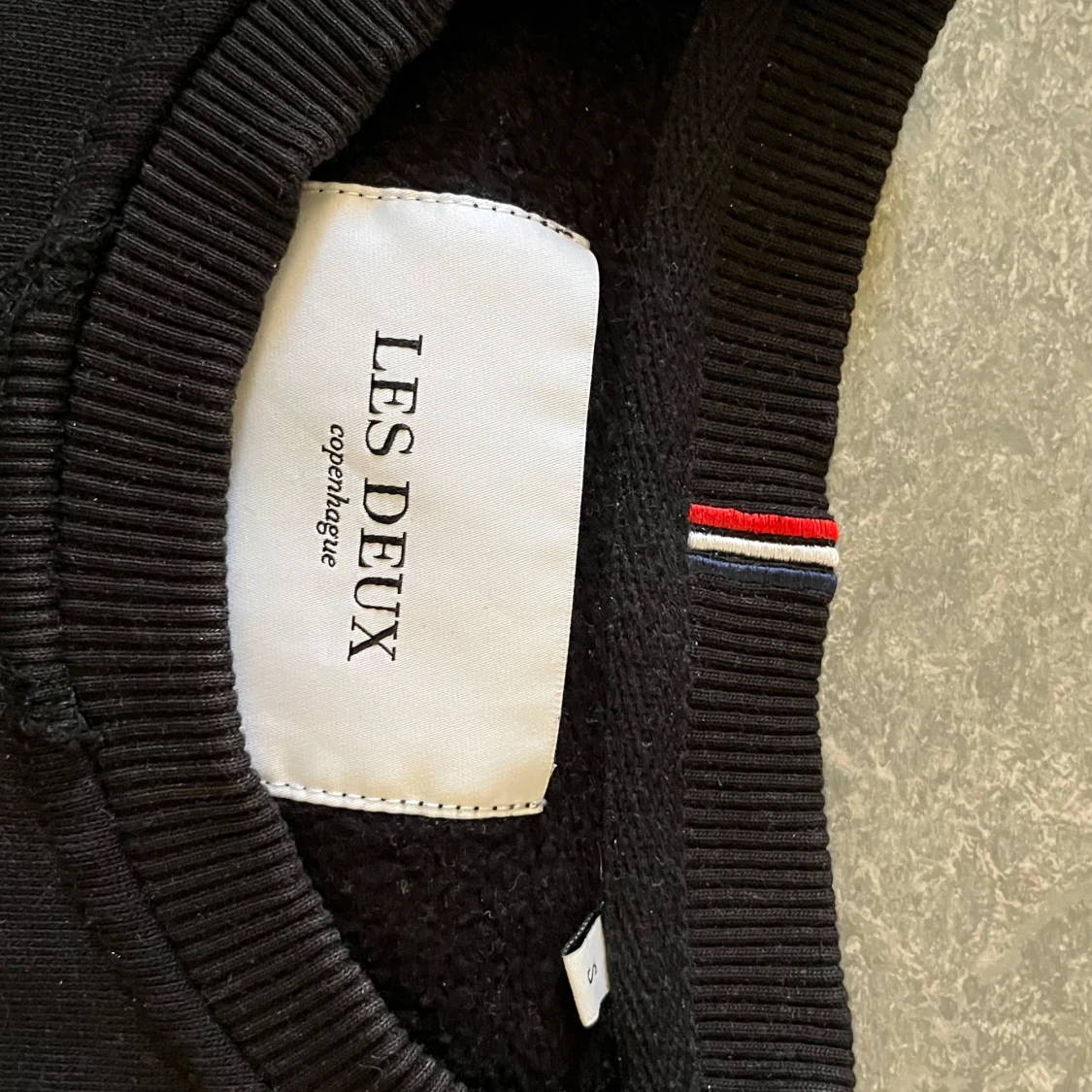 Svart sweatshirt från Les Deux med rund halsringning och ribbade muddar. Liten broderad patch med blått H på bröstet och diskret detalj i rött, vitt och blått vid halsen. Perfekt basic-tröja med clean look.
