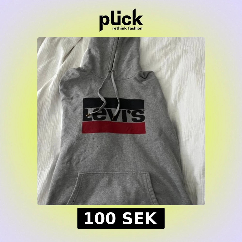 Säljer en grå hoodie från Levi's med en stor logga i svart och rött på framsidan. Tröjan har en klassisk känguruficka och justerbar huva med dragsko. Perfekt för en avslappnad stil.