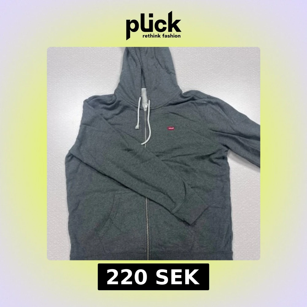 Säljer en stilren grå hoodie från Levi's med dragkedja och justerbar huva. Perfekt för en avslappnad look. Den har en liten röd logga på bröstet och praktiska fickor framtill.
