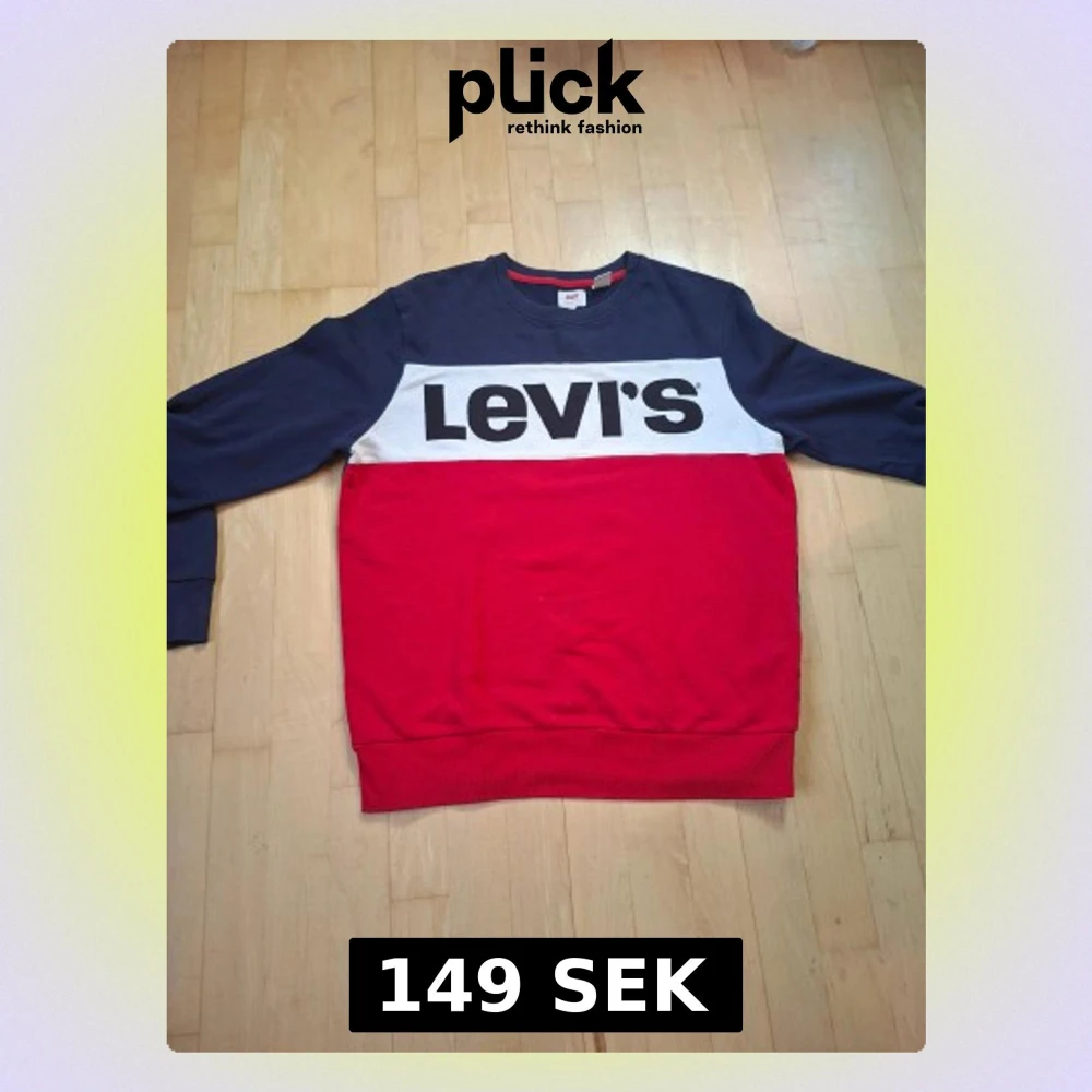 Säljer en Levi's sweatshirt i storlek L med breda färgblock i marinblått, vitt och rött. Tröjan har rund hals, långa ärmar och stor logotyp framtill. Tillverkad i mjuk bomull, perfekt för dig som gillar streetwear och tydliga färger.