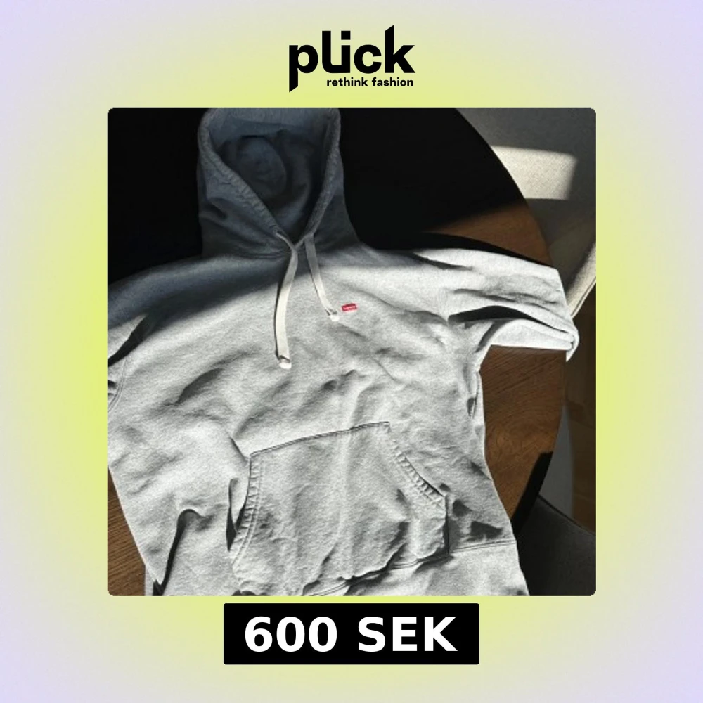 Säljer en klassisk grå hoodie från Supreme med liten röd logotyp på bröstet. Tröjan har huva med snören och en stor magficka framtill. Perfekt för en avslappnad stil. Storlek Medium men passar även S. Äkthetsbevis finns.