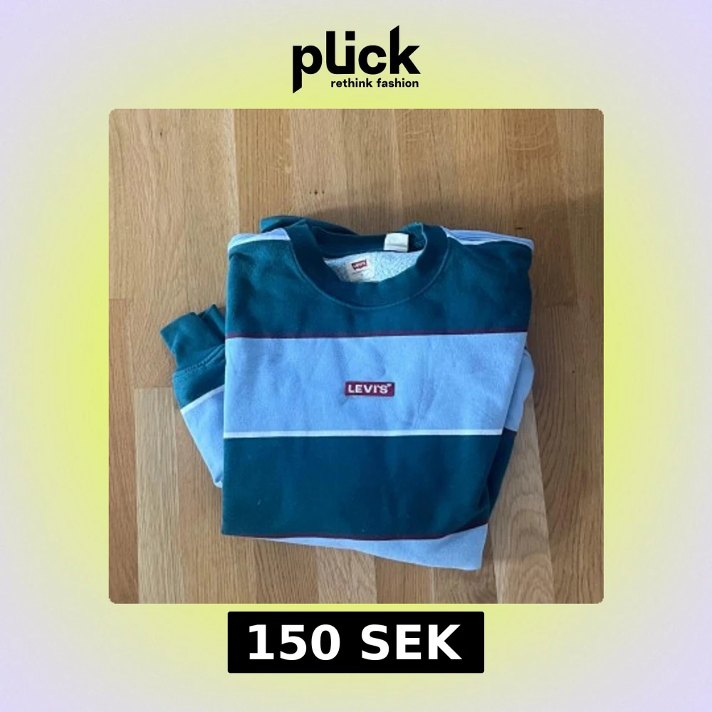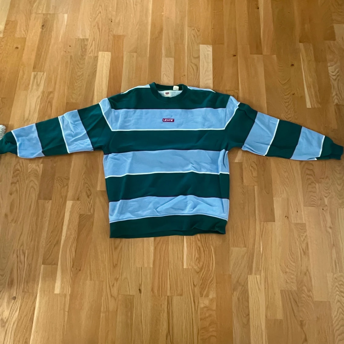 Säljer en snygg randig tröja från Levi's i mörkgrönt och ljusblått med klassisk logga på bröstet. Tröjan har rund hals, långa ärmar och är gjord i mjuk bomull. Perfekt för dig som gillar streetstyle och vill sticka ut lite extra.