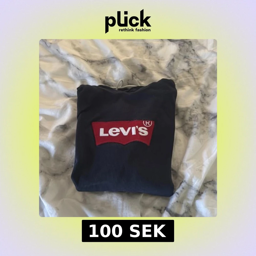 Säljer en svart hoodie från Levi's med det klassiska röda och vita logotypen på bröstet. Tröjan har en justerbar huva med vita snören och en praktisk magficka. Perfekt för en avslappnad stil.