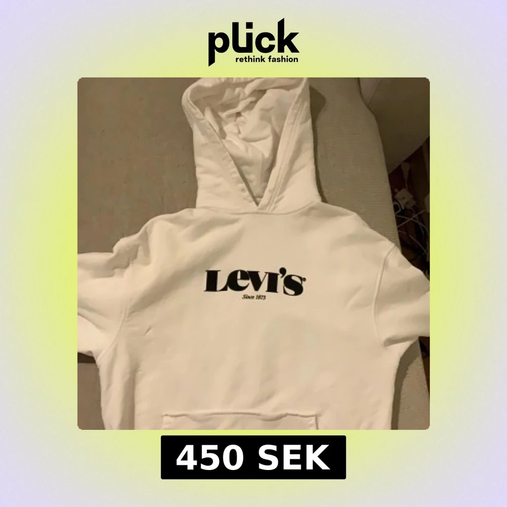 Säljer en klassisk vit hoodie från Levi's med svart logotyp på framsidan. Den har en bekväm passform och en praktisk huva. Perfekt för en avslappnad stil.