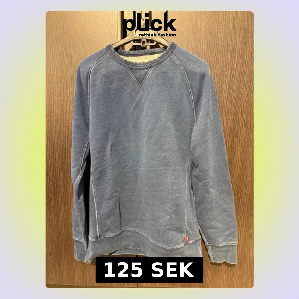 Säljer en chill blå sweatshirt från Levi's med klassisk rund hals och synliga sömmar. Tröjan har lång ärm och en liten röd Levi's-tag vid nederkanten. Perfekt för dig som gillar enkel och stilren streetwear.