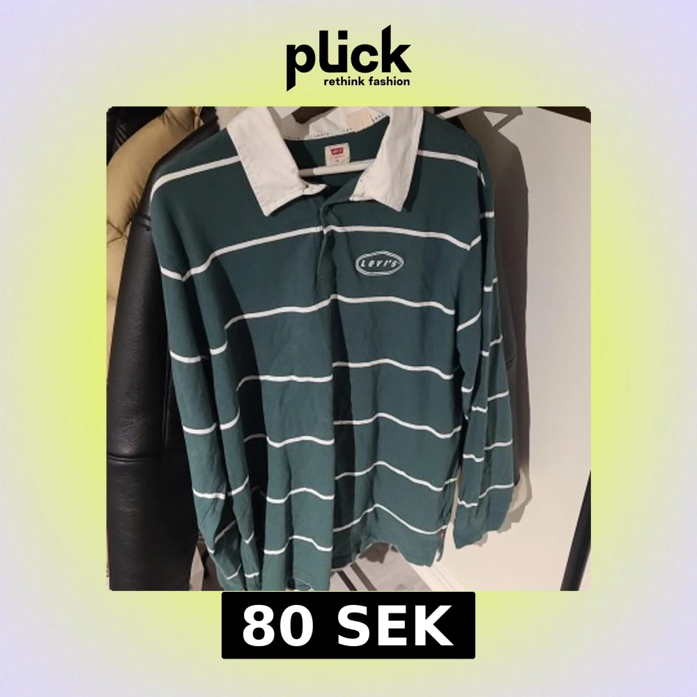 Säljer en snygg grön och vit randig pikétröja från Levi's. Tröjan har en klassisk krage i vitt och långa ärmar. Perfekt för en avslappnad stil. Levi's-loggan är broderad på bröstet.