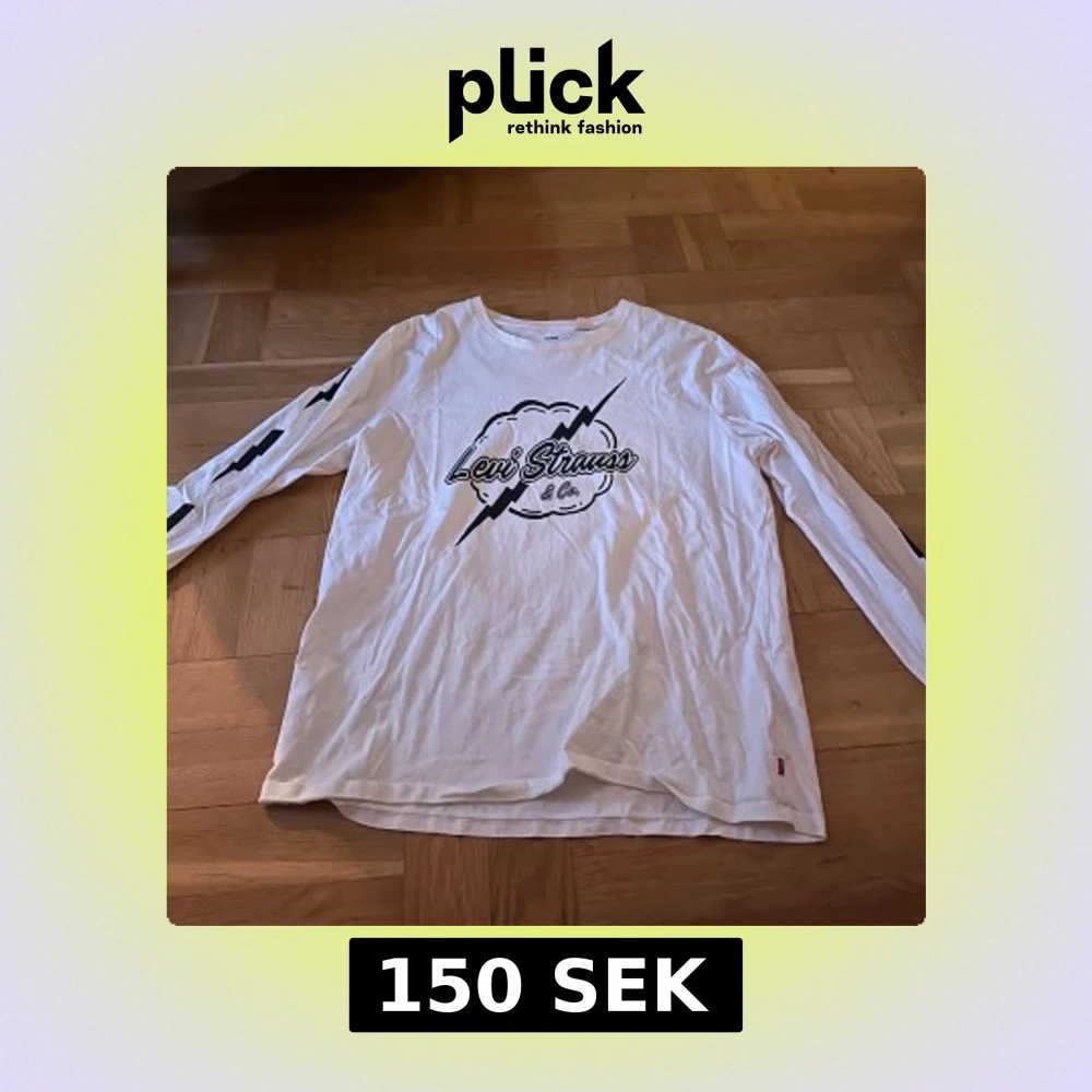 Vit långärmad tröja från Levi's med svart blixt- och molntryck på bröstet samt svarta blixtar längs ärmarna. Använd ett par gånger.