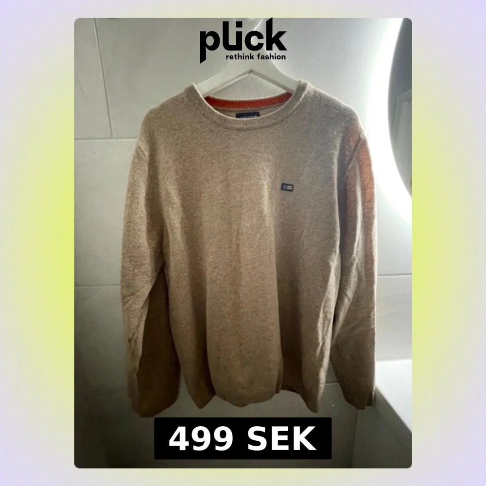 Snygg beige stickad tröja från Lexington med rund hals och diskret logga på bröstet. Insidan av kragen har en cool orange ribbad detalj som ger extra stil. Perfekt för dig som gillar klassisk men ändå chill look.