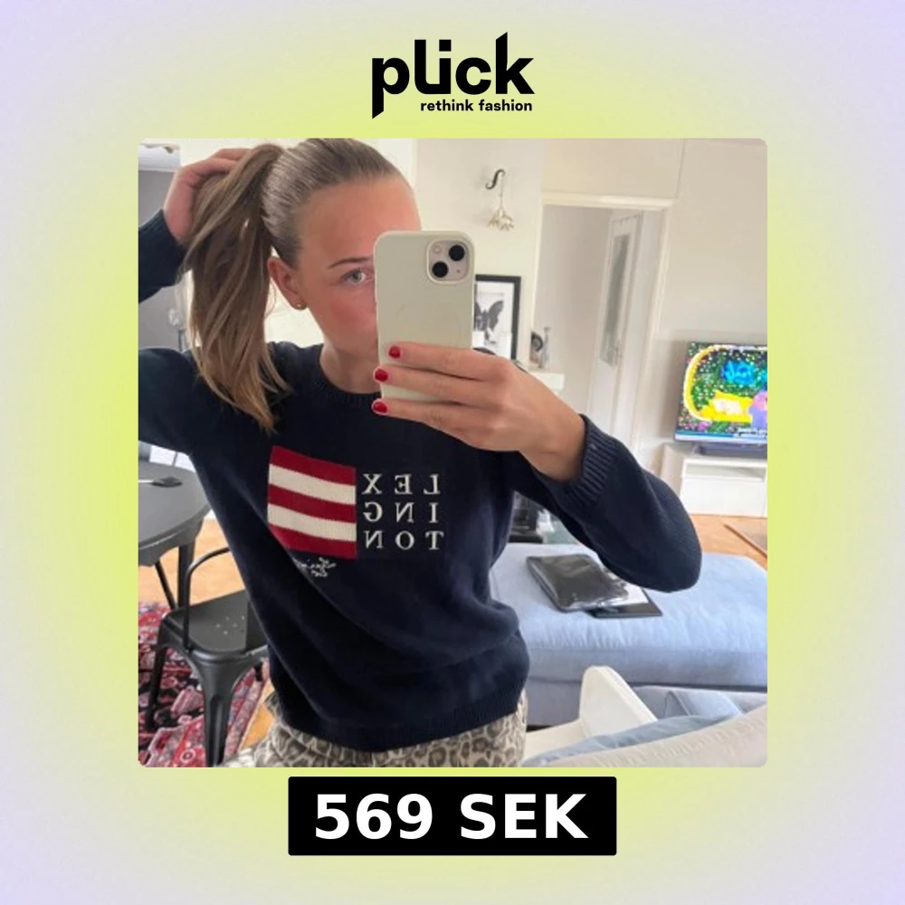 Säljer en mörkblå stickad tröja från Lexington med vit text och en rödvit randig flaggdetalj på bröstet. Tröjan har rund halsringning och långa ärmar, perfekt för dig som gillar klassisk preppy stil. Som ny