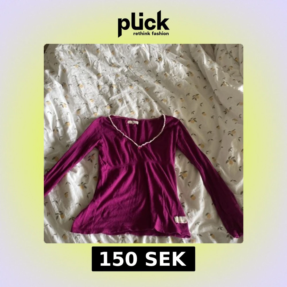 Säljer en lila långärmad topp från Odd Molly med v-ringning, vit spetskant och en liten rosett framtill. Toppen har broderad text på sidan och är tillverkad i ett ribbat material. Perfekt för dig som gillar unika detaljer!