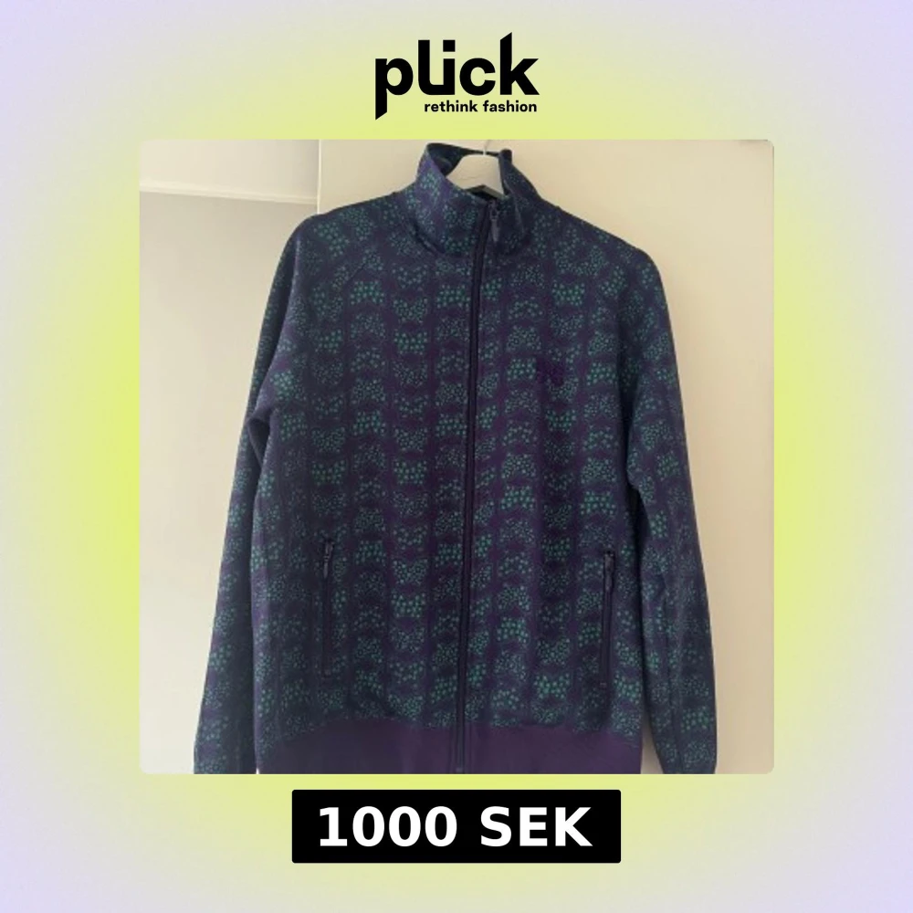 Säljer en unik jacka från Needles i storlek M. Jackan är lila med grönt fjärilsmönster, har hög krage, dragkedja framtill och två fickor med dragkedja. Materialet är troligtvis polyester och passformen är normal. Perfekt för dig som vill sticka ut med coola detaljer.den är köpt på caliroots. Mer eller mindre i nyskick!