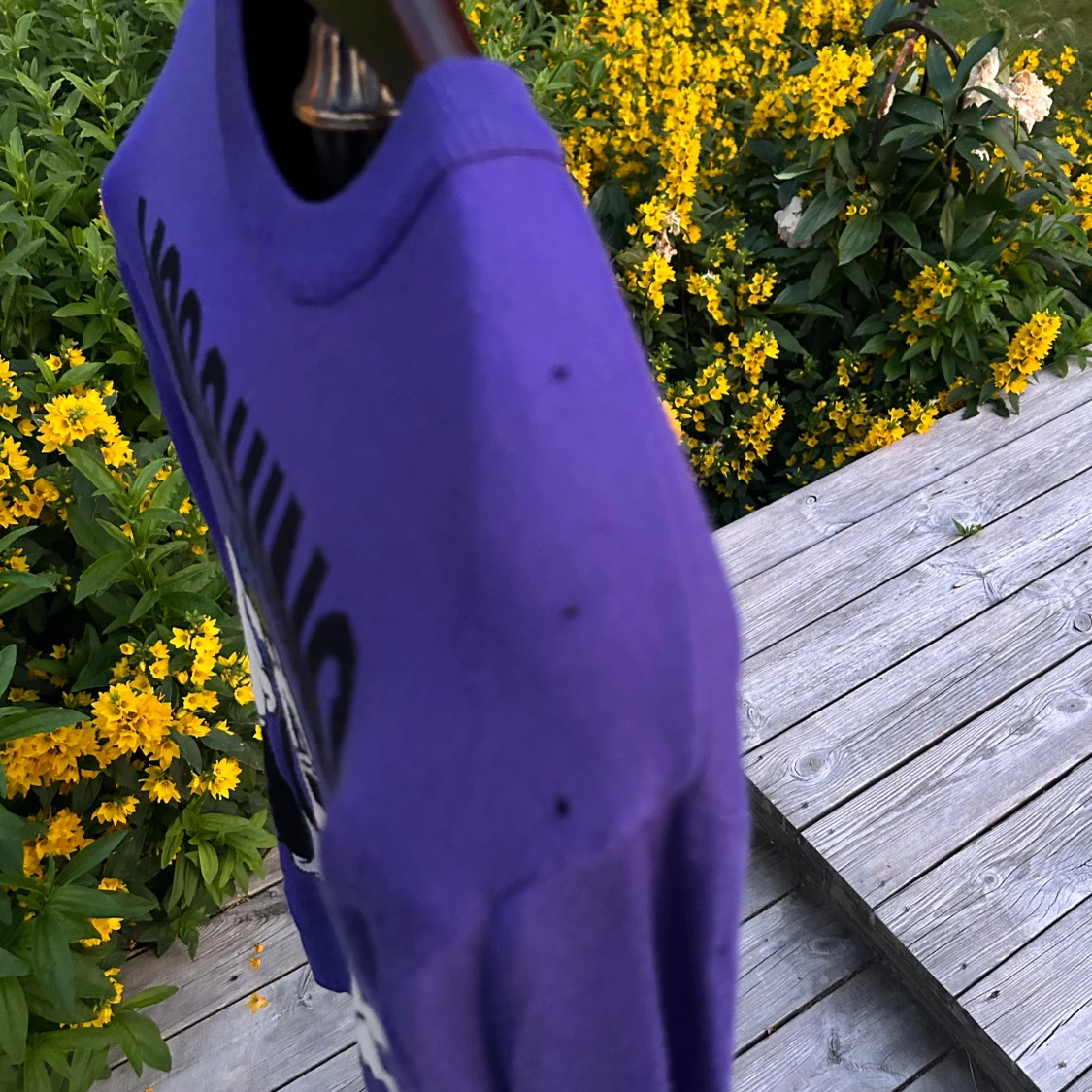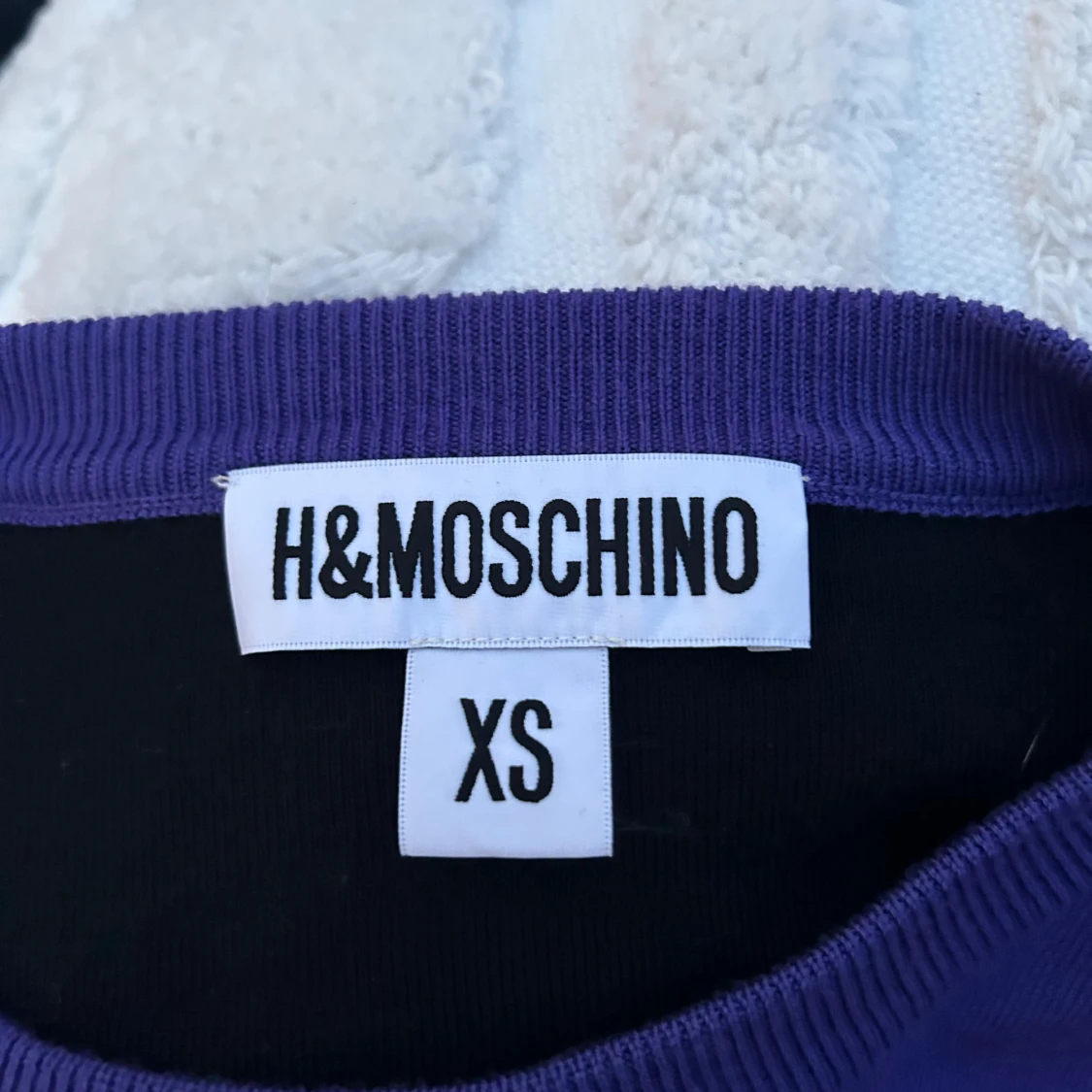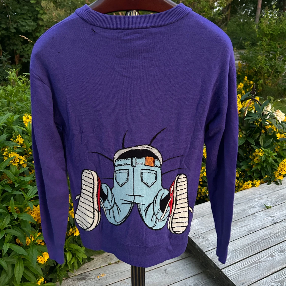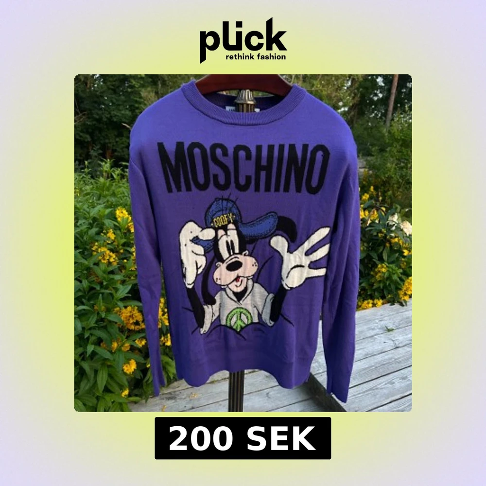 Supercool lila stickad tröja från Moschino x H&M i samarbete, med stor Goofy-illustration fram och bak. Tröjan har rund hals, långa ärmar och en relaxed vibe. Perfekt statement piece för dig som gillar färg och Disney. Dem ända defekterna ser ni på bilderna.