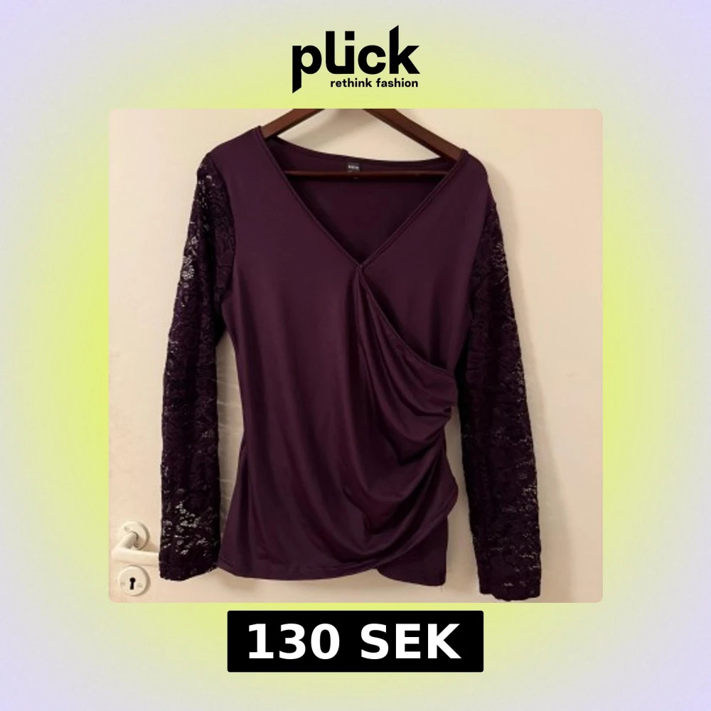 Snygg lila omlottopp med spetsdetaljer på ärmarna. Toppen har en v-ringad design och långa ärmar, perfekt för en stilren look. Passar utmärkt till både jeans och kjol.