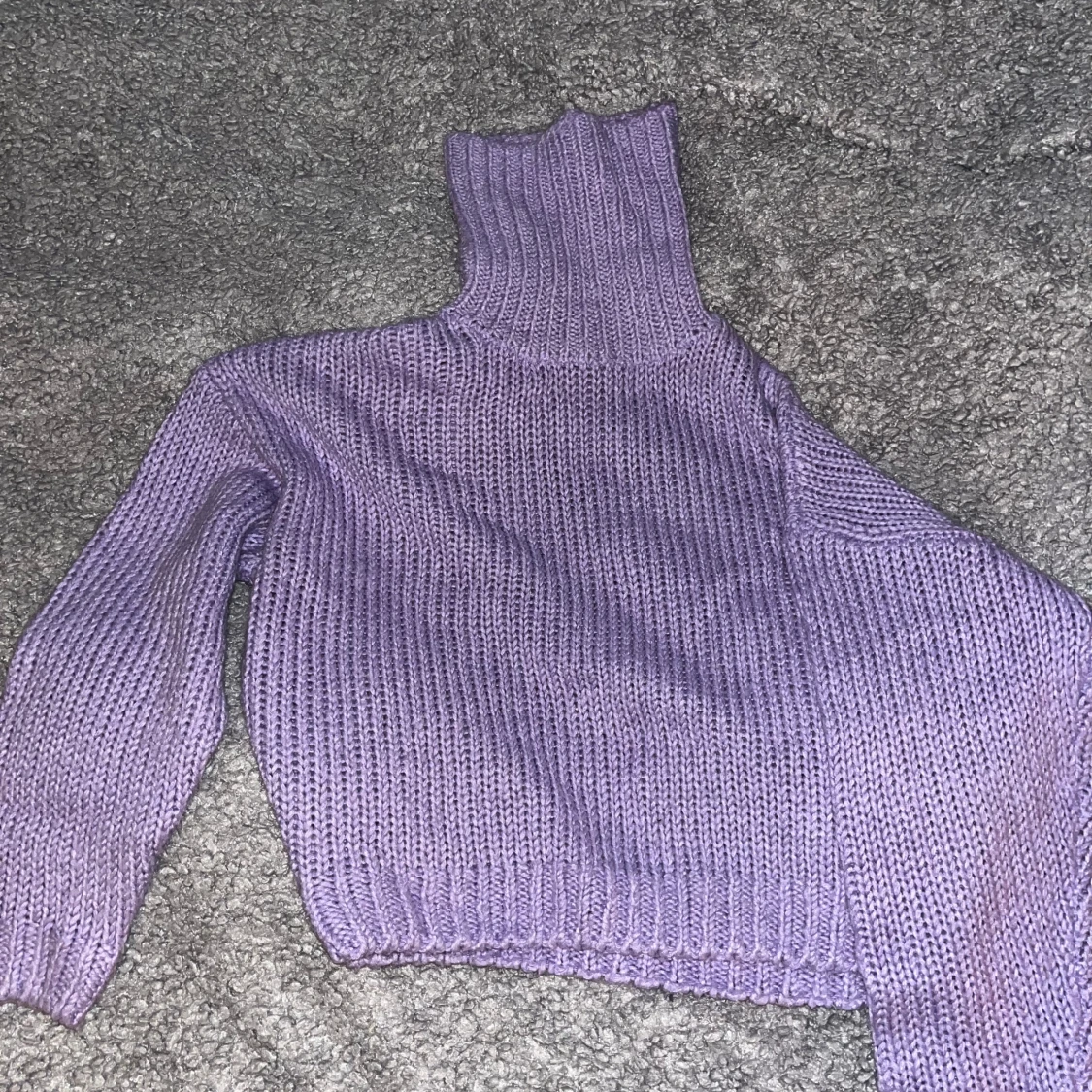 Säljer en mysig lila stickad polotröja med hög krage. Tröjan har långa ärmar och ribbstickade detaljer vid ärmslut och nederkant. Perfekt för kyliga dagar!